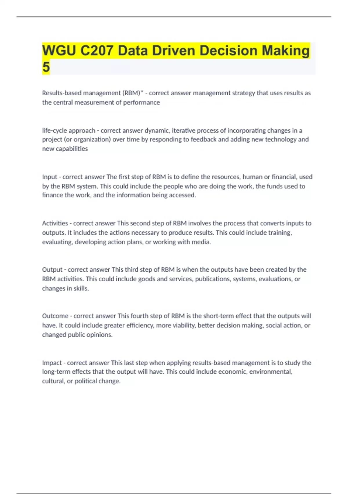 life-cycle approach - correct answer dynamic, iterative process of incorporating changes in a project (or organization) over time by responding to feedback and adding new technology and new capabilities Input - correct answer The first step of RBM is to define the resources, human or financial, used by the RBM system. This could include the people who are doing the work, the funds used to finance the work, and the information being accessed. Activities - correct answer This second step of RBM involves the process that converts inputs to outputs. It includes the actions necessary to produce results. This could include training, evaluating, developing action plans, or working with media.