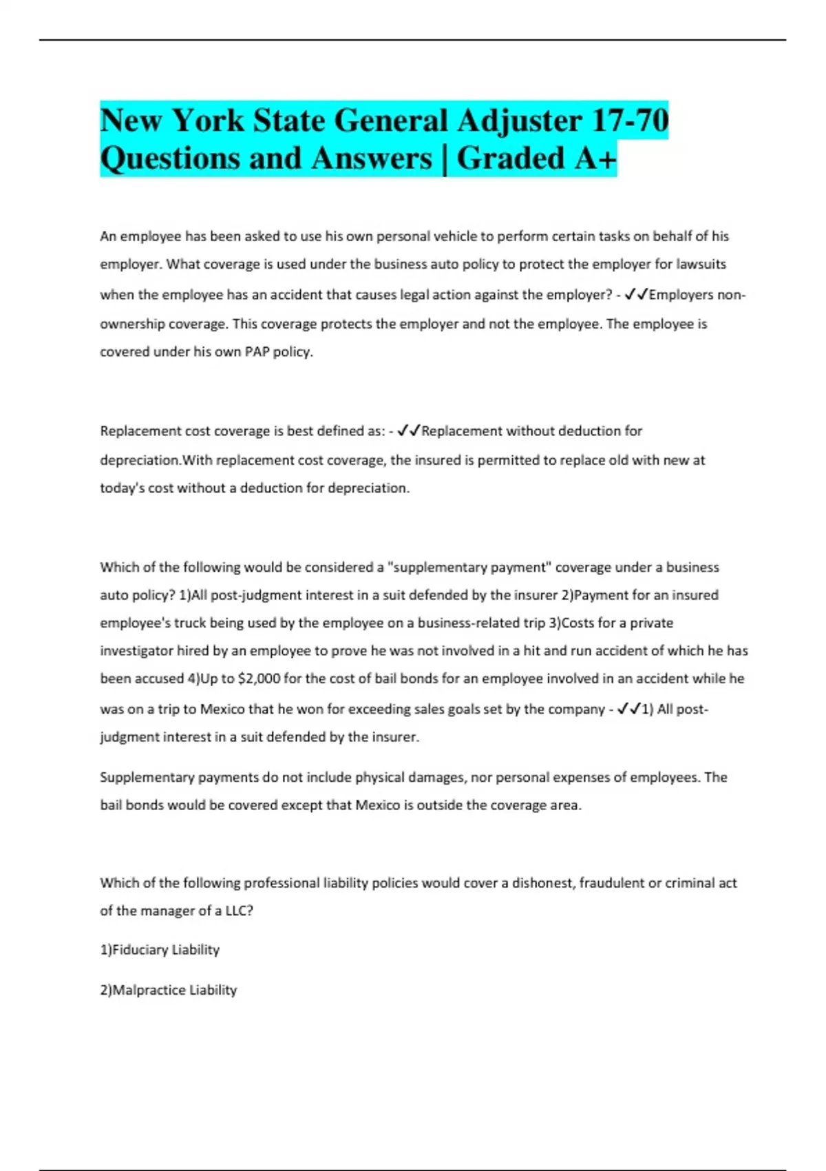 New York State General Adjuster 17-70 Questions and Answers | Graded A+