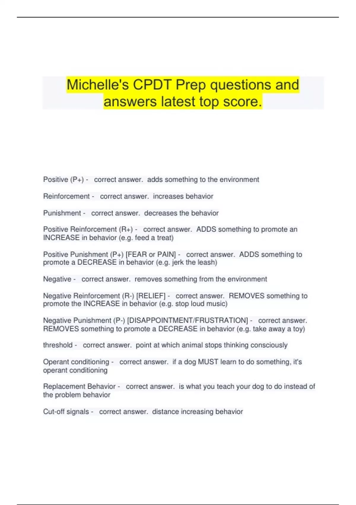 Michelle's CPDT Prep questions and answers latest top score. Positive (P+) - correct answer. adds something to the environment Reinforcement - correct answer. increases behavior Punishment - correct answer. decreases the behavior Positive Reinforcement (R+) - correct answer. ADDS something to promote an INCREASE in behavior (e.g. feed a treat) Positive Punishment (P+) [FEAR or PAIN] - correct answer. ADDS something to promote a DECREASE in behavior (e.g. jerk the leash) Negative - correct answer. removes something from the environment Negative Reinforcement (R-) [RELIEF] - correct answer. REMOVES something to promote the INCREASE in behavior (e.g. stop loud music) Negative Punishment (P-) [DISAPPOINTMENT/FRUSTRATION] - correct answer. REMOVES something to promote a DECREASE in behavior (e.g. take away a toy) threshold - correct answer. point at which animal stops thinking consciously Operant conditioning - correct answer. if a dog MUST learn to do something, it's operant conditioning Replacement Behavior - correct answer. is what you teach your dog to do instead of the problem behavior Cut-off signals - correct answer. distance increasing behavior Habituation - correct answer. The ability to stop reacting to meaningless stimuli [NOTE: stimulus that elicits really strong reactions, e.g. fear - often don't habituate] Sensitization - correct answer. [Sort of opposite of habituation] (some dogs) reaction to a repeated stimulus gets stronger instead of dispersing [NOTE: stimulus that elicits really strong reactions, e.g. fear - often don't habituate] Adaptation - correct answer. ..refers to the physical process of tiring. Learned Irrelevance - correct answer. ...an animal that ceases attending to a stimulus because it has no consequences - is displaying learned irrelevance. Also know as pre-exposure effect. Piloerector Reflex - correct answer. ... Aversion - correct answer. Any stimulus the removal of which is reinforcing; (adj) characterizing an event that is likely to be avoided (Chance, Paul. Learning & Behavior, 5th Ed. 448) Anecdotal Evidence - correct answer. First - or - second-hand reports of personal experience (Chance, Paul. Learning & Behavior, 5th Ed. 448) Behavior - correct answer. Anything a person or animal does that can be measured. In practice, the term usually refers to publicly observable overt behavior. However, behavior that is available only to the person performing int (such as thinking) may be included if it can reliably be measured. (Chance, Paul. Learning & Behavior, 5th ED. 448) Backward Chaining - correct answer. A chaining procedure in which training begins with the last link in the chain and adds preceding links in reverse order. (Chance, Paul. Learning & Behavior, 5th Ed. 448) Baseline Period - correct answer. In a within-subject experiment, a period of observation (often designated "A") during which no attempt is made to modify the behavior under study. (chance, Paul. Learning & Behavior, 5th Ed. 448) Behavior Chain - correct answer. A series of related behaviors, the last of which produces reinforcement (Chance, Paul. Learning & Behavior, 5th Ed. 448) CER - correct answer. Conditional Emotional Response Blocking - correct answer. Failure of a stimulus to become a CS (conditioned stimulus) when it is part of a compound stimulus that includes an effective CS. The effective CS is said to block the formation of a new CS (cf. overshadowing.) (chance, paul. Learning & Behavior, 5th Ed. 448) Classical Conditioning - correct answer. Classical conditioning (also Pavlovian conditioning or respondent conditioning) is a form of learning in which one stimulus, the conditioned stimulus or CS, comes to signal the occurrence of a second stimulus, the unconditioned stimulus or US. The US is usually a biologically significant stimulus such as food or pain that elicits a response from the start; this is called the unconditioned response or UR. The CS usually produces no particular response at first, but after conditioning it elicits the conditioned response or CR. Chaining - correct answer. In operant training, the procedure of establishing a behavior chain. (see behavior chain, forward chaining, backward chaining.) (chance, paul. Learning & behavior, 5th Ed. 453) Conditioned Emotional Response - correct answer. An emotional response to a stimulus that is acquired through Pavlovian conditioning 107. the procedure of pairing a neutral stimulus (typically referred to as the CS) with a US. Also called Pavlovian or respondent conditioning. (chance, paul. Learning & Behavior, 5th Ed. 449) Respondent Conditioning - correct answer. The procedure of pairing a neutral stimulus (typically referred to as the CS) with a US. Also called Pavlovian or classical conditioning. (chance, paul. Learning & Behavior, 5th Ed. 453) Conditioned Response - correct answer. The response part of a conditional reflex; the response elicited by a conditional stimulus. Often called conditional response. Abbreviated CR. (chance, paul. Learning & Behavior, 5th Ed. 449) Conditioned Reinforcer - correct answer. Any reinforcer that has acquired its reinforcing properties through its association with other reinforcers. Also called conditioned reinforcer. (chance, paul. learning & behavior, 5th Ed. 454) Contiguity - correct answer. Nearness of events in time (temporal contiguity) or space (spatial contiguity). (chance, 449) Conditional Stimulus - correct answer. The stimulus part of a conditional reflex, the stimulus that elicits a conditional response. Often called conditioned stimulus. (chance, paul. 449) Continuous Reinforcement - correct answer. A reinforcement schedule in which behavior is reinforced each time it occurs. Abbreviated CRF (cf. intermittent schedule.) (chance, paul. 449) Contingency - correct answer. A dependency between events. An event may be stimulus-contingent (dependent on the appearance of a stimulus) or response-contingent (dependent on the appearance of a behavior). (chance, paul. 449) Contr