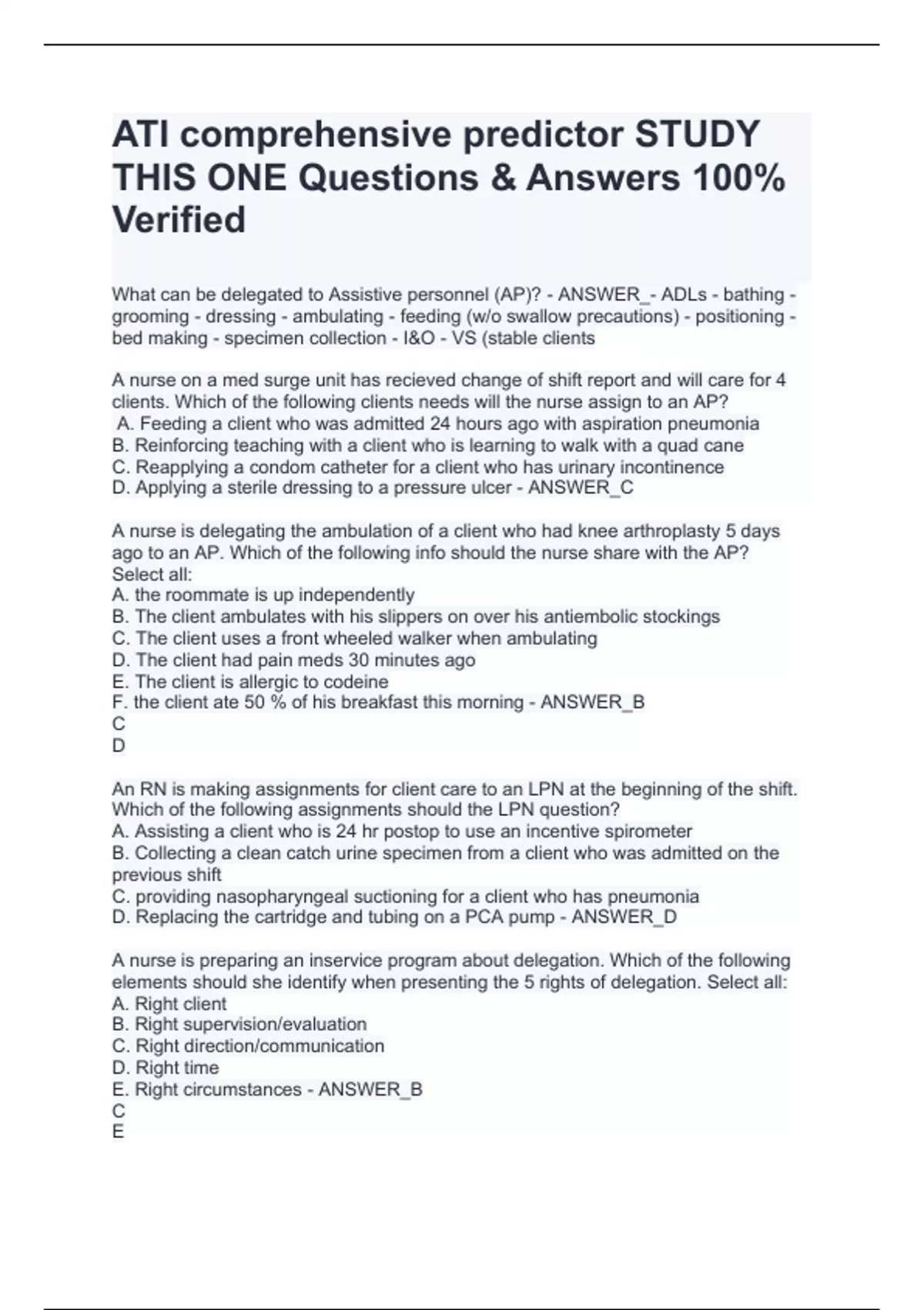 A nurse is delegating the ambulation of a client who had knee arthroplasty 5 days ago to an AP. Which of the following info should the nurse share with the AP? Select all: A. the roommate is up independently B. The client ambulates with his slippers on over his antiembolic stockings C. The client uses a front wheeled walker when ambulating D. The client had pain meds 30 minutes ago E. The client is allergic to codeine F. the client ate 50 % of his breakfast this morning - ANSWER_B C D An RN is making assignments for client care to an LPN at the beginning of the shift. Which of the following assignments should the LPN question? A. Assisting a client who is 24 hr postop to use an incentive spirometer B. Collecting a clean catch urine specimen from a client who was admitted on the previous shift C. providing nasopharyngeal suctioning for a client who has pneumonia D. Replacing the cartridge and tubing on a PCA pump - ANSWER_D A nurse is preparing an inservice program about delegation. Which of the following elements should she identify when presenting the 5 rights of delegation. Select all: A. Right client B. Right supervision/evaluation C. Right direction/communication D. Right time E. Right circumstances - ANSWER_B C E