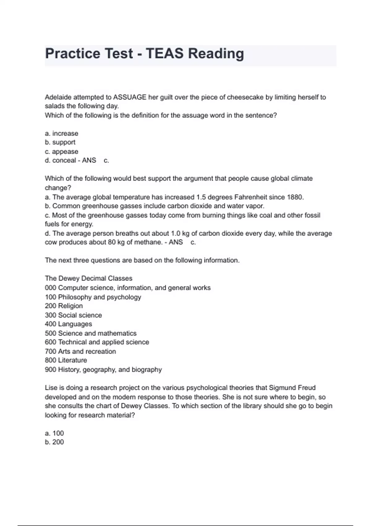 Practice Test - TEAS Reading Exam Questions And Answers Adelaide attempted to ASSUAGE her guilt over the piece of cheesecake by limiting herself to salads the following day. Which of the following is the definition for the assuage word in the sentence? a. increase b. support c. appease d. conceal - ANS c. Which of the following would best support the argument that people cause global climate change? a. The average global temperature has increased 1.5 degrees Fahrenheit since 1880. b. Common greenhouse gasses include carbon dioxide and water vapor. c. Most of the greenhouse gasses today come from burning things like coal and other fossil fuels for energy. d. The average person breaths out about 1.0 kg of carbon dioxide every day, while the average cow produces about 80 kg of methane. - ANS c. The next three questions are based on the following information. The Dewey Decimal Classes 000 Computer science, information, and general works 100 Philosophy and psychology 200 Religion 300 Social science 400 Languages 500 Science and mathematics 600 Technical and applied science 700 Arts and recreation 800 Literature 900 History, geography, and biography Lise is doing a research project on the various psychological theories that Sigmund Freud developed and on the modern response to those theories. She is not sure where to begin, so she consults the chart of Dewey Classes. To which section of the library should she go to begin looking for research material? a. 100 b. 200 c. 300