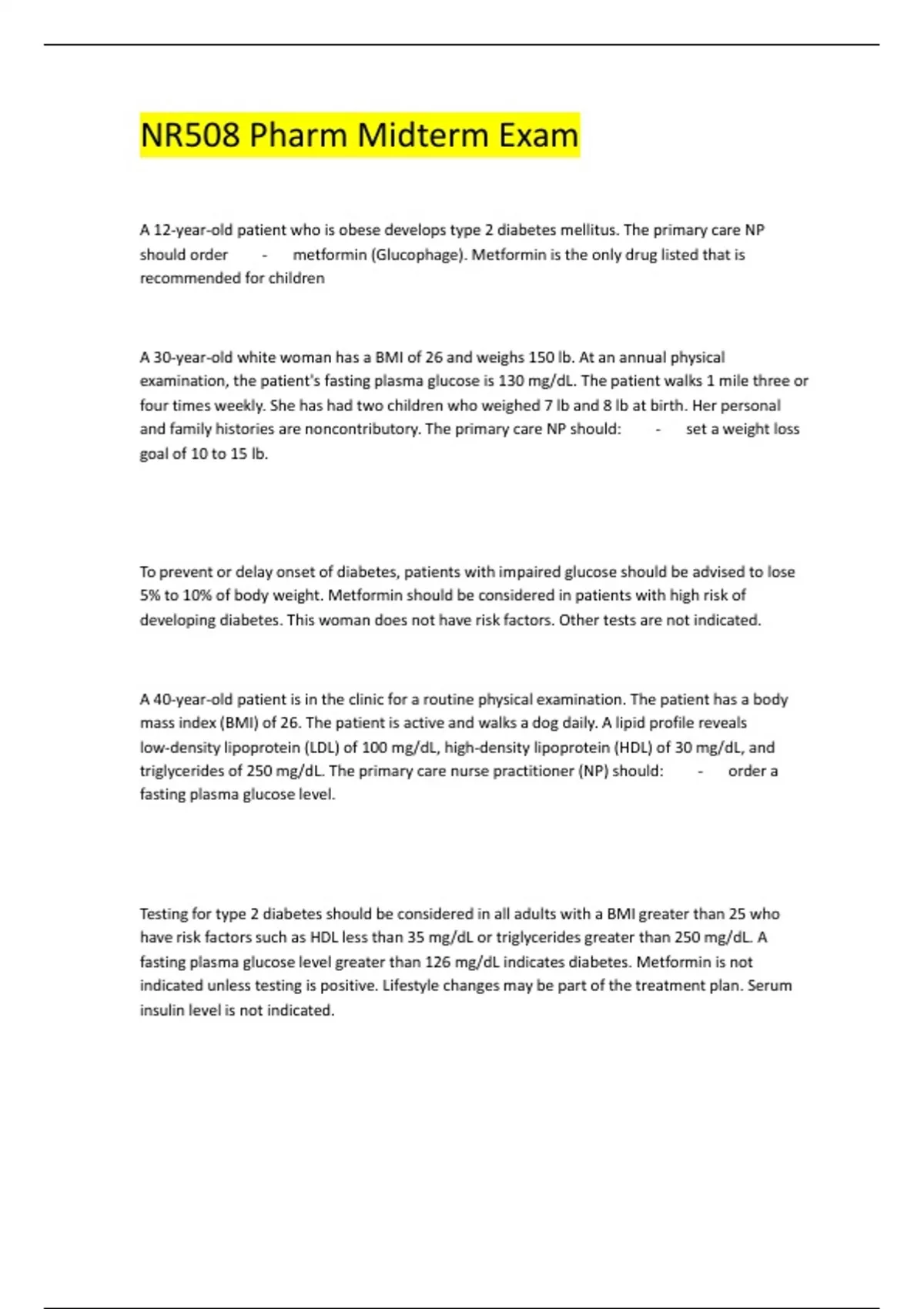 NR508 Pharm Midterm Exam A 12-year-old patient who is obese develops type 2 diabetes mellitus. The primary care NP should order - metformin (Glucophage). Metformin is the only drug listed that is recommended for children A 30-year-old white woman has a BMI of 26 and weighs 150 lb. At an annual physical examination, the patient's fasting plasma glucose is 130 mg/dL. The patient walks 1 mile three or four times weekly. She has had two children who weighed 7 lb and 8 lb at birth. Her personal and family histories are noncontributory. The primary care NP should: - set a weight loss goal of 10 to 15 lb. To prevent or delay onset of diabetes, patients with impaired glucose should be advised to lose 5% to 10% of body weight. Metformin should be considered in patients with high risk of developing diabetes. This woman does not have risk factors. Other tests are not indicated. A 40-year-old patient is in the clinic for a routine physical examination. The patient has a body mass index (BMI) of 26. The patient is active and walks a dog daily. A lipid profile reveals low-density lipoprotein (LDL) of 100 mg/dL, high-density lipoprotein (HDL) of 30 mg/dL, and triglycerides of 250 mg/dL. The primary care nurse practitioner (NP) should: - order a fasting plasma glucose level. Testing for type 2 diabetes should be considered in all adults with a BMI greater than 25 who have risk factors such as HDL less than 35 mg/dL or triglycerides greater than 250 mg/dL. A fasting plasma glucose level greater than 126 mg/dL indicates diabetes. Metformin is not indicated unless testing is positive. Lifestyle changes may be part of the treatment plan. Serum insulin level is not indicated. A 50-year-old woman who is postmenopausal is taking an aromatase inhibitor as part of a breast cancer treatment regimen. She calls her primary care NP to report that she has had hot flashes and increased vaginal discharge but no bleeding. The NP should: - schedule her for a gynecologic examination. Any abnormal vaginal discharge should be reported immediately and should be evaluated with a gynecologic examination to rule out carcinoma. She is not showing signs of ovulation, so contraception is not necessary. She should not stop taking the medication unless the gynecologic examination is positive. These are common side effects but are not always normal. A 55-year-old patient with no prior history of hypertension has a blood pressure greater than 140/90 on three separate occasions. The patient does not smoke, has a body mass index of 24, and exercises regularly. The patient has no known risk factors for cardiovascular disease. The primary care NP should: - perform a careful cardiovascular physical assessment. If the patient is younger than 20 or older than 50 years old at the onset of elevated blood pressure, the NP should look for causes of secondary hypertension. The physical examination should include a careful cardiovascular assessment. This patient will need pharmacologic treatment, but not until the underlying cause of hypertension is determined. A 55-year-old woman has a history of myocardial infarction (MI). A lipid profile reveals LDL of 130 mg/dL, HDL of 35 mg/dL, and triglycerides 150 mg/dL. The woman is sedentary with a body mass index of 26. The woman asks the primary care NP about using a statin medication. The NP should: - begin therapy with atorvastatin 10 mg per day This woman would be using a statin medication for secondary prevention because she already has a history of MI, so a statin should be prescribed. Dietary and lifestyle changes should be a part of therapy, but not the only therapy. She is relatively young, and quality-of-life issues are not a concern. There is no clinical evidence to support use of statins as primary prevention in women. A parent brings a child who has moderate-persistent asthma to the clinic and tells the primary care NP that none of the child's medications are working. The parent says, "Everybody tells me something different. I don't know what to do." The NP suspects that the parent is not administering the medications appropriately. The NP should initially: - perform a careful history of the child's symptoms and the medications that are given. Clinical providers must refine listening and questioning skills and focus on the patient and the environment. It is important to begin with a thorough history and to elicit the patient's understanding of a disease or a medication to identify potential problems. Providing written action plans, reviewing past providers' prescriptions, and explaining medications are useful only after the NP determines what the problem is. A patient bursts into tears when the primary care NP diagnoses diabetes. The NP should: - ask the patient about past experiences with anyone who has this diagnosis. To help patients participate in their disease management, the NP must have an understanding of the patient's concerns and fears. The first step when the patient is obviously upset is to determine what the patient knows and fears about the disease. A patient comes to the clinic and asks the primary care NP about using a newly developed formulation of the drug the patient has been taking for a year. When deciding whether or not to prescribe this formulation, the NP should: - tell the patient that when postmarketing data is available, it will be considered. About 6 to 12 months of postmarketing experience can yield information about drug efficacy and side effects, so patients should be cautioned to wait for these data. Drug company promotional materials have biased information. Most new drugs are more expensive, and costs alone should not determine drug choice. Extended-release forms are often more expensive. A patient comes to the clinic reporting dizziness and fatigue associated with nausea and vomiting. The primary care NP suspects anemia and orders a complete blood count. The patient's hemoglobin is elevated. The NP correctly concludes that the patient is not anemic. The NP 