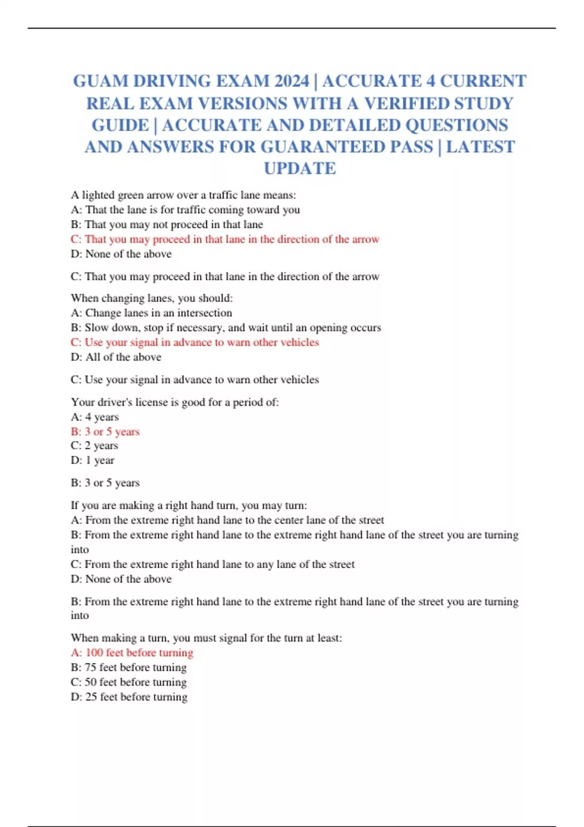 GUAM DRIVING EXAM 2024 | ACCURATE 4 CURRENT REAL EXAM VERSIONS WITH A VERIFIED STUDY GUIDE | ACCURATE AND DETAILED QUESTIONS AND ANSWERS FOR GUARANTEED PASS | LATEST UPDATE