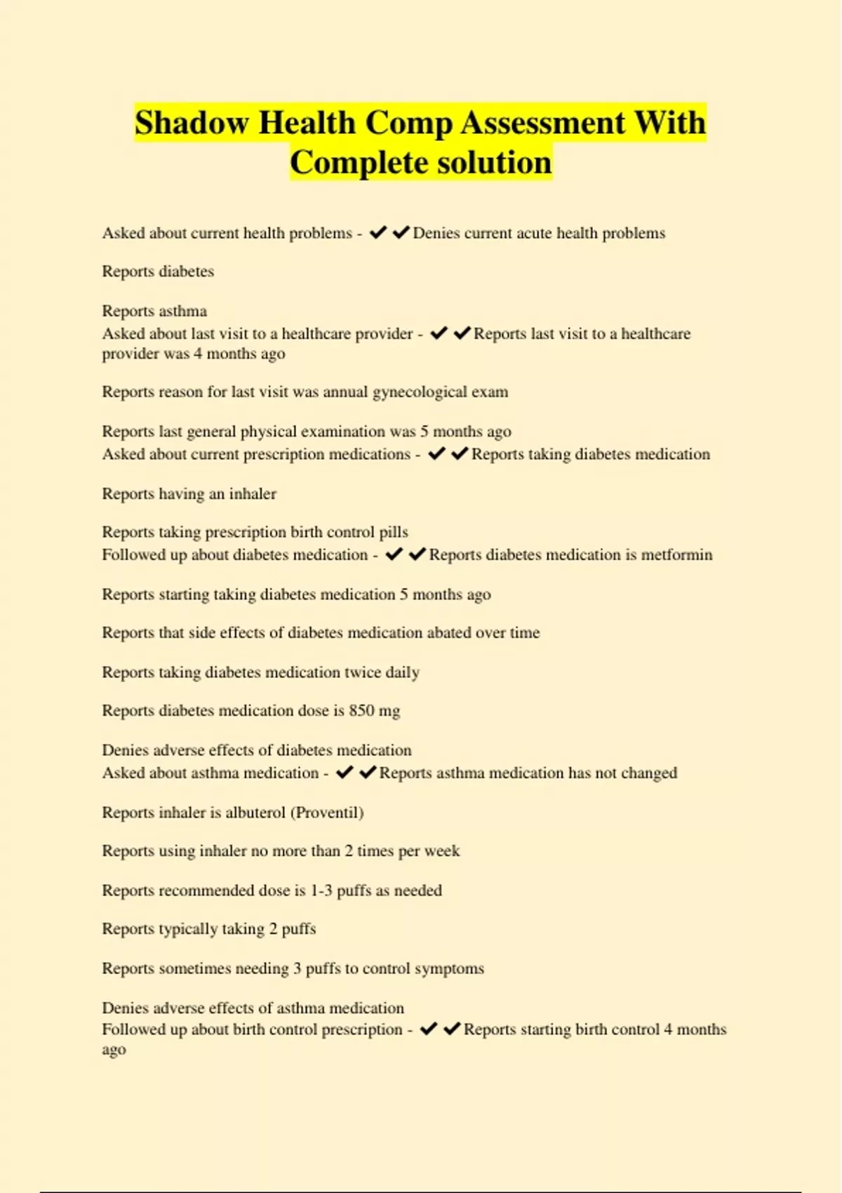Shadow Health Comp Assessment With Complete solution Asked about current health problems - ️️Denies current acute health problems Reports diabetes Reports asthma Asked about last visit to a healthcare provider - ️️Reports last visit to a healthcare provider was 4 months ago Reports reason for last visit was annual gynecological exam Reports last general physical examination was 5 months ago Asked about current prescription medications - ️️Reports taking diabetes medication Reports having an inhaler Reports taking prescription birth control pills Followed up about diabetes medication - ️️Reports diabetes medication is metformin