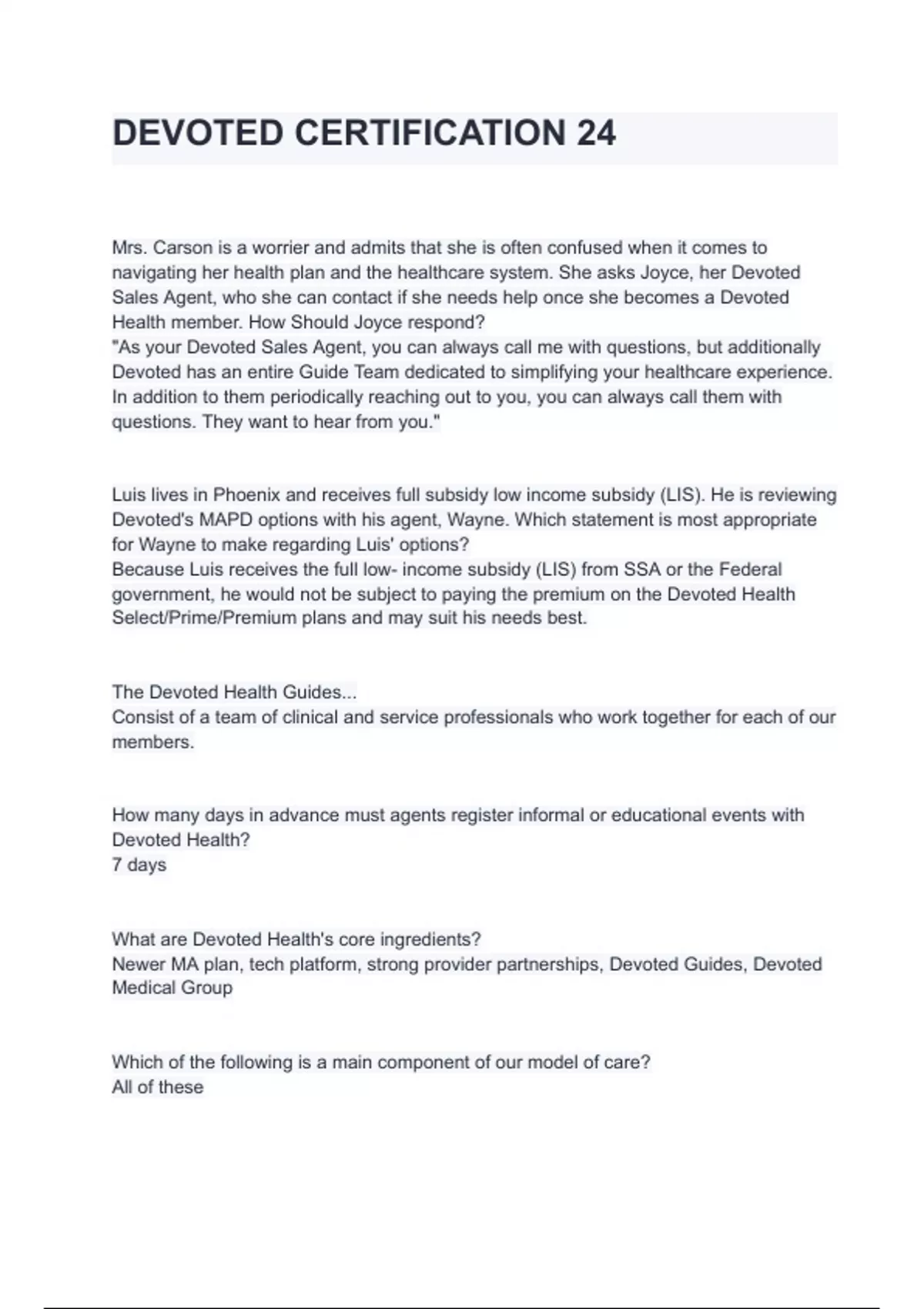 DEVOTED CERTIFICATION 24 Exam Questions And Answers Mrs. Carson is a worrier and admits that she is often confused when it comes to navigating her health plan and the healthcare system. She asks Joyce, her Devoted Sales Agent, who she can contact if she needs help once she becomes a Devoted Health member. How Should Joyce respond? "As your Devoted Sales Agent, you can always call me with questions, but additionally Devoted has an entire Guide Team dedicated to simplifying your healthcare experience. In addition to them periodically reaching out to you, you can always call them with questions. They want to hear from you." Luis lives in Phoenix and receives full subsidy low income subsidy (LIS). He is reviewing Devoted's MAPD options with his agent, Wayne. Which statement is most appropriate for Wayne to make regarding Luis' options? Because Luis receives the full low- income subsidy (LIS) from SSA or the Federal government, he would not be subject to paying the premium on the Devoted Health Select/Prime/Premium plans and may suit his needs best. The Devoted Health Guides... Consist of a team of clinical and service professionals who work together for each of our members. How many days in advance must agents register informal or educational events with Devoted Health? 7 days