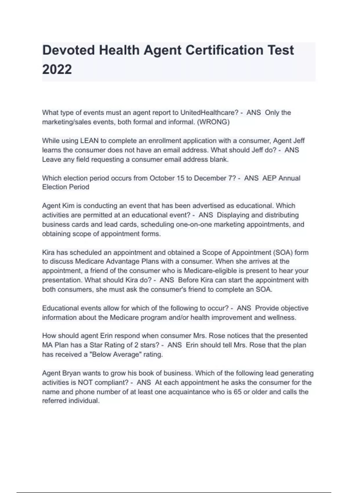 Devoted Health Agent Certification Test 2022 Questions And Answers What type of events must an agent report to UnitedHealthcare? - ANS Only the marketing/sales events, both formal and informal. (WRONG) While using LEAN to complete an enrollment application with a consumer, Agent Jeff learns the consumer does not have an email address. What should Jeff do? - ANS Leave any field requesting a consumer email address blank. Which election period occurs from October 15 to December 7? - ANS AEP Annual Election Period Agent Kim is conducting an event that has been advertised as educational. Which activities are permitted at an educational event? - ANS Displaying and distributing business cards and lead cards, scheduling one-on-one marketing appointments, and obtaining scope of appointment forms. Kira has scheduled an appointment and obtained a Scope of Appointment (SOA) form to discuss Medicare Advantage Plans with a consumer. When she arrives at the appointment, a friend of the consumer who is Medicare-eligible is present to hear your presentation. What should Kira do? - ANS Before Kira can start the appointment with both consumers, she must ask the consumer's friend to complete an SOA.