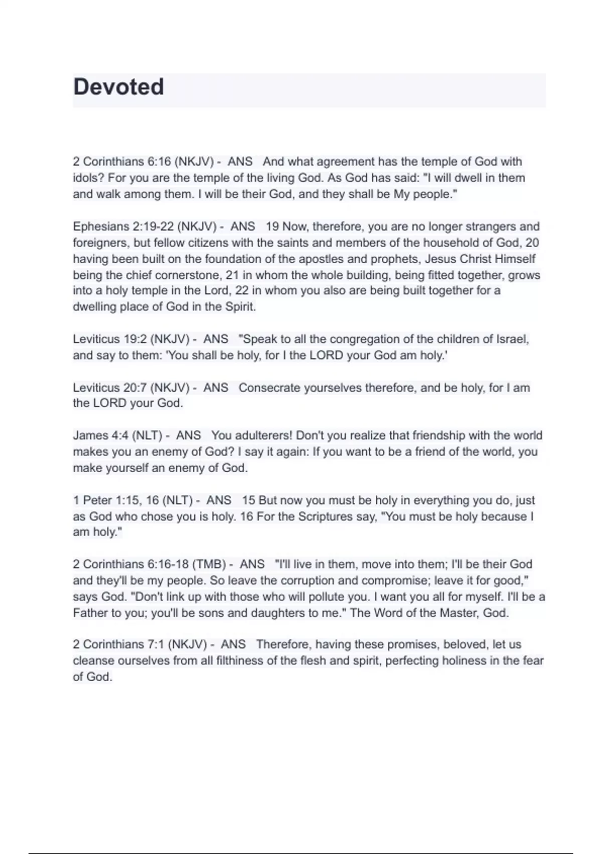 Devoted Exam Questions And Answers 2 Corinthians 6:16 (NKJV) - ANS And what agreement has the temple of God with idols? For you are the temple of the living God. As God has said: "I will dwell in them and walk among them. I will be their God, and they shall be My people." Ephesians 2:19-22 (NKJV) - ANS 19 Now, therefore, you are no longer strangers and foreigners, but fellow citizens with the saints and members of the household of God, 20 having been built on the foundation of the apostles and prophets, Jesus Christ Himself being the chief cornerstone, 21 in whom the whole building, being fitted together, grows into a holy temple in the Lord, 22 in whom you also are being built together for a dwelling place of God in the Spirit. Leviticus 19:2 (NKJV) - ANS "Speak to all the congregation of the children of Israel, and say to them: 'You shall be holy, for I the LORD your God am holy.