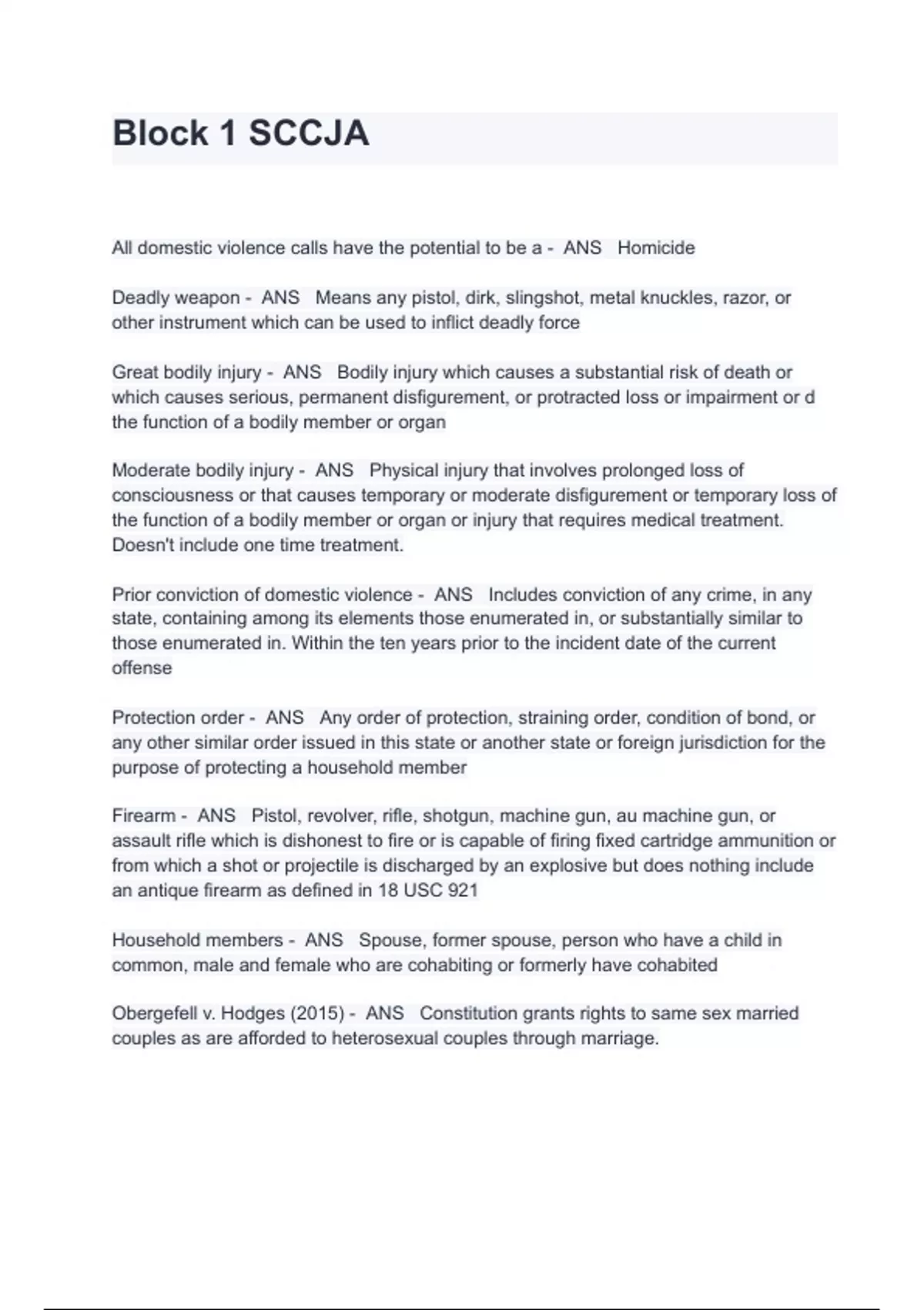 Block 1 SCCJA Exam Questions And Answers All domestic violence calls have the potential to be a - ANS Homicide Deadly weapon - ANS Means any pistol, dirk, slingshot, metal knuckles, razor, or other instrument which can be used to inflict deadly force Great bodily injury - ANS Bodily injury which causes a substantial risk of death or which causes serious, permanent disfigurement, or protracted loss or impairment or d the function of a bodily member or organ Moderate bodily injury - ANS Physical injury that involves prolonged loss of consciousness or that causes temporary or moderate disfigurement or temporary loss of the function of a bodily member or organ or injury that requires medical treatment. Doesn't include one time treatment. Prior conviction of domestic violence - ANS Includes conviction of any crime, in any state, containing among its elements those enumerated in, or substantially similar to those enumerated in. Within the ten years prior to the incident date of the current offense Protection order - ANS Any order of protection, straining order, condition of bond, or any other similar order issued in this state or another state or foreign jurisdiction for the purpose of protecting a household member Firearm - ANS Pistol, revolver, rifle, shotgun, machine gun, au machine gun, or assault rifle which is dishonest to fire or is capable of firing fixed cartridge ammunition or from which a shot or projectile is discharged by an explosive but does nothing include an antique firearm as defined in 18 USC 921 Household members - ANS Spouse, former spouse, person who have a child in common, male and female who are cohabiting or formerly have cohabited Obergefell v. Hodges (2015) - ANS Constitution grants rights to same sex married couples as are afforded to heterosexual couples through marriage.