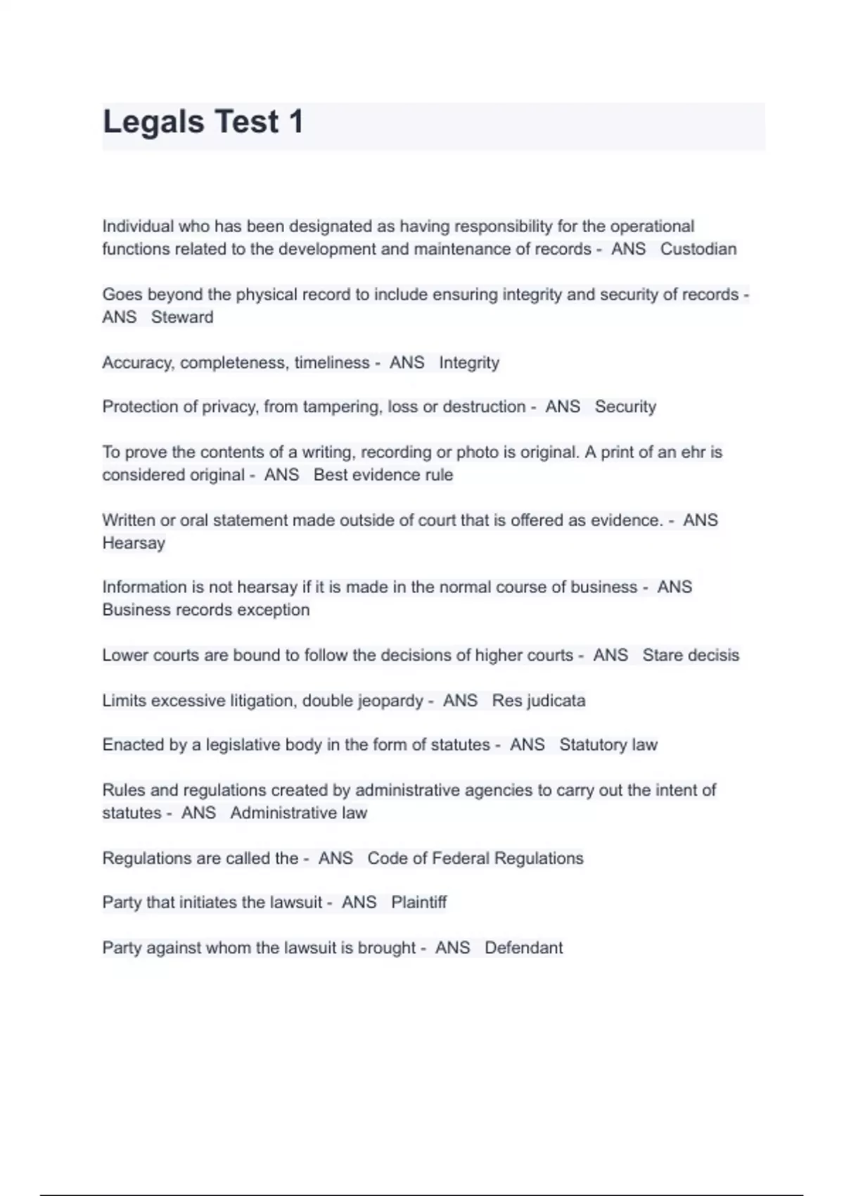 Legals Test 1 Questions And Answers Individual who has been designated as having responsibility for the operational functions related to the development and maintenance of records - ANS Custodian Goes beyond the physical record to include ensuring integrity and security of records - ANS Steward Accuracy, completeness, timeliness - ANS Integrity Protection of privacy, from tampering, loss or destruction - ANS Security To prove the contents of a writing, recording or photo is original. A print of an ehr is considered original - ANS Best evidence rule Written or oral statement made outside of court that is offered as evidence. - ANS Hearsay Information is not hearsay if it is made in the normal course of business - ANS Business records exception Lower courts are bound to follow the decisions of higher courts - ANS Stare decisis Limits excessive litigation, double jeopardy - ANS Res judicata Enacted by a legislative body in the form of statutes - ANS Statutory law Rules and regulations created by administrative agencies to carry out the intent of statutes - ANS Administrative law Regulations are called the - ANS Code of Federal Regulations Party that initiates the lawsuit - ANS Plaintiff Party against whom the lawsuit is brought - ANS Defendant