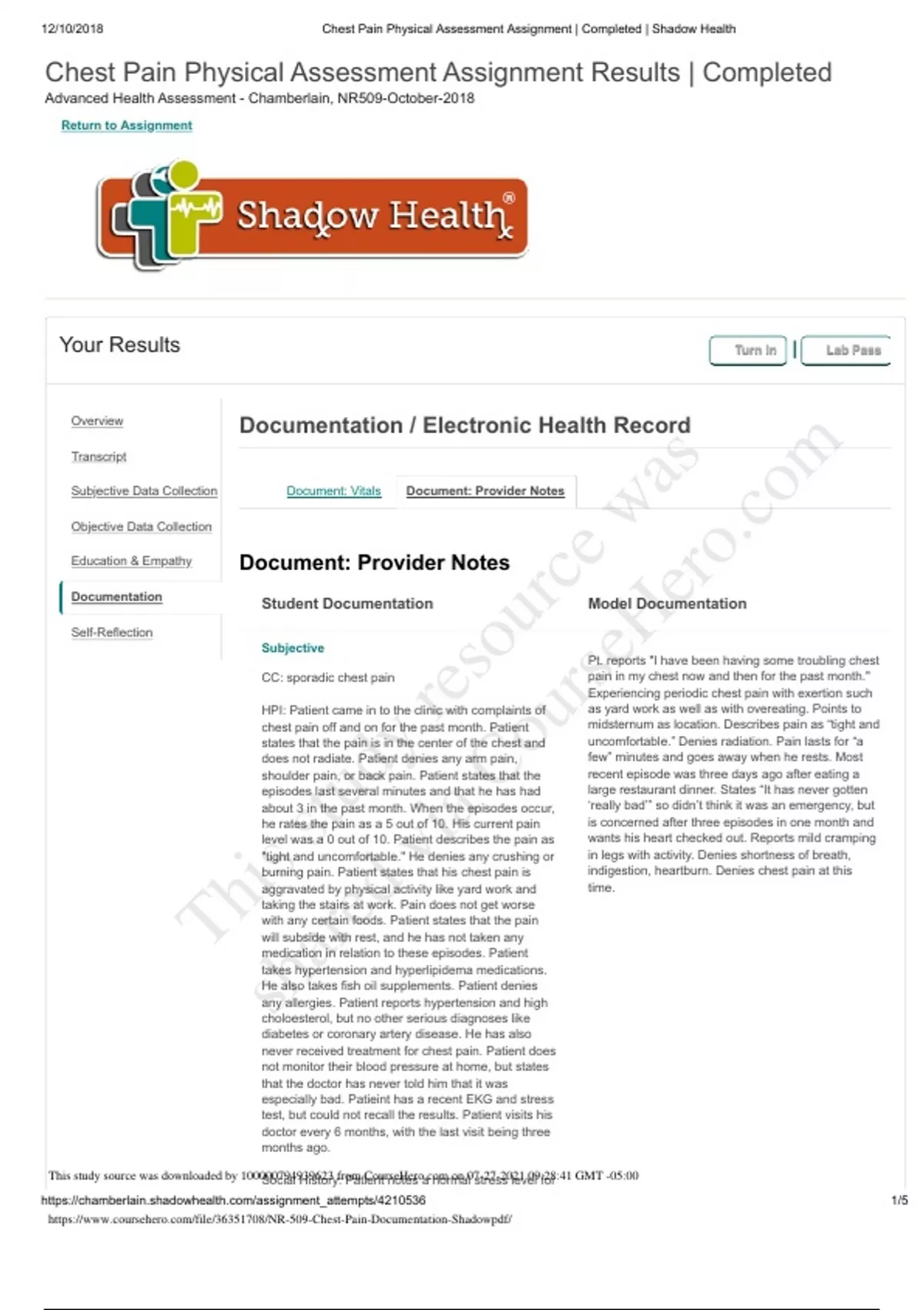 Chest Pain Assignment Completed Shadow Health -Documentation