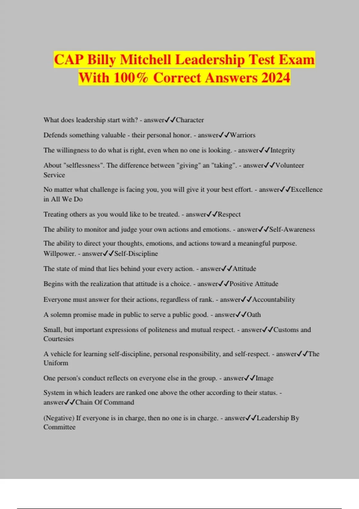 CAP Billy Mitchell Leadership Test Exam With 100% Correct Answers 2024 What does leadership start with? - answerCharacter Defends something valuable - their personal honor. - answerWarriors The willingness to do what is right, even when no one is looking. - answerIntegrity About "selflessness". The difference between "giving" an "taking". - answerVolunteer Service No matter what challenge is facing you, you will give it your best effort. - answerExcellence in All We Do Treating others as you would like to be treated. - answerRespect The ability to monitor and judge your own actions and emotions. - answerSelf-Awareness The ability to direct your thoughts, emotions, and actions toward a meaningful purpose. Willpower. - answerSelf-Discipline The state of mind that lies behind your every action. - answerAttitude Begins with the realization that attitude is a choice. - answerPositive Attitude Everyone must answer for their actions, regardless of rank. - answerAccountability A solemn promise made in public to serve a public good. - answerOath Small, but important expressions of politeness and mutual respect. - answerCustoms and Courtesies A vehicle for learning self-discipline, personal responsibility, and self-respect. - answerThe Uniform One person's conduct reflects on everyone else in the group. - answerImage System in which leaders are ranked one above the other according to their status. - answerChain Of Command (Negative) If everyone is in charge, then no one is in charge. - answerLeadership By Committee When an individual takes an issue to a high-level leader without consulting their immediate superiors. - answerJumping the Chain Leaders in training. - answerCadets are ________ Directing and controlling your actions so that you can achieve your goals. - answerSelf- Management Dream with a deadline. - answerA goal is a Clear and Compelling description of what you want your life to look like at some point in the future. - answerFuture Pictu