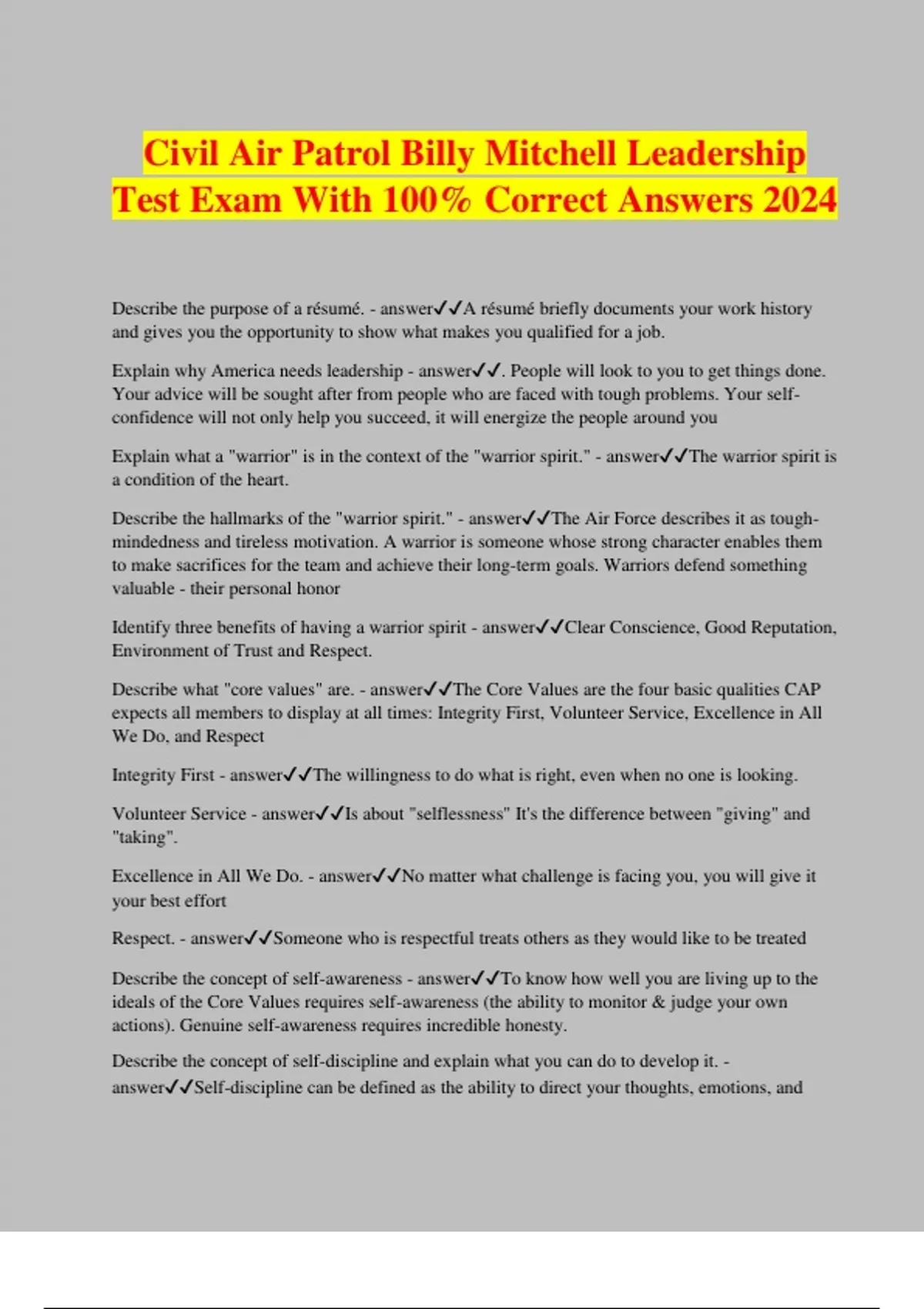 Civil Air Patrol Billy Mitchell Leadership Test Exam With 100% Correct Answers 2024 Describe the purpose of a résumé. - answerA résumé briefly documents your work history and gives you the opportunity to show what makes you qualified for a job. Explain why America needs leadership - answer. People will look to you to get things done. Your advice will be sought after from people who are faced with tough problems. Your self- confidence will not only help you succeed, it will energize the people around you Explain what a "warrior" is in the context of the "warrior spirit." - answerThe warrior spirit is a condition of the heart. Describe the hallmarks of the "warrior spirit." - answerThe Air Force describes it as tough- mindedness and tireless motivation. A warrior is someone whose strong character enables them to make sacrifices for the team and achieve their long-term goals. Warriors defend something valuable - their personal honor Identify three benefits of having a warrior spirit - answerClear Conscience, Good Reputation, Environment of Trust and Respect. Describe what "core values" are. - answerThe Core Values are the four basic qualities CAP expects all members to display at all times: Integrity First, Volunteer Service, Excellence in All We Do, and Respect Integrity First - answerThe willingness to do what is right, even when no one is looking. Volunteer Service - answerIs about "selflessness" It's the difference between "giving" and "taking". Excellence in All We Do. - answerNo matter what challenge is facing you, you will give it your best effort Respect. - answerSomeone who is respectful treats others as they would like to be treated Describe the concept of self-awareness - answerTo know how well you are living up to the ideals of the Core Values requires self-awareness (the ability to monitor & judge your own actions). Genuine self-awareness requires incredible honesty. Describe the concept of self-discipline and explain what you can do to develop it. - answerSelf-discipline can be defined as the ability to direct your thoughts, emotions, and actions toward a meaningful purpose. Cadets learn self-discipline on the drill field and by wearing their uniform to exacting standards. Other ways to increase self-discipline include strengthening your work habits - on a regular basis, try to do something that is necessary but not "fun." Describe the concept of attitude and explain why attitudes are contagious. - answerThe state of mind that lies behind your every action is called attitude. All attitudes, good and bad, are contagious. Describe what you can do to develop a positive attitude. - answerA positive attitude begins in the realization that attitude is a choice - you can choose to be positive, or you can choose to be negative Why must leaders be accountable? - answerEveryone must answer for their actions, regardless of their rank. Even the president is accountable to the American people. Explain what an oath is. - answerAn oath is a solemn promise. Recite the Cadet Oath from memory - answerI pledge that I will serve faithfully in the Civil Air Patrol Cadet Program, and that I will attend meetings regularly, participate actively in unit activities, obey my officers, wear my uniform properly, and advance my education and training rapidly to prepare myself to be of service to my community, state, and nation. "I pledge that I will serve faithfully in the Civil Air Patrol Cadet Program ..." - answerBeing faithful means being true and doing what you say you will do. "... and that I will attend meetings regularly, ..." - answerWhile you may need to miss a few meetings once in a while due to other commitments, you pledge to attend squadron meetings on a regular basis "... participate actively in unit activities, ..." - answerYou promise to be enthusiastic about what cadets do. "... obey my officers, ..." - answerHere you acknowledge you don't have all the answers. You realize there are people who have more experience than you, and you'll follow their guidance. "... wear my uniform properly ..." - answerThere is a right way and a wrong way to wear the uniform. Recognizing this, you promise to represent CAP and the US Air Force well by always looking sharp in uniform. "... and advance my education and training rapidly ..." - answerThe word "cadet" can be defined as "a young person in training to become a leader." Therefore, a cadet's primary job is to learn how to lead "... to prepare myself to be of service to my community, state, and nation." - answerCAP is a volunteer organization whose main purpose is community service. Everything we do is altruistic, meaning that it is for the benefit of others, not ourselves personally. Identify what is the root of all military customs and courtesies. - answerAll military customs and courtesies are rooted in basic politeness and respect. What are customs and courtesies? - answerThey are small, but important expressions of politeness and mutual r
