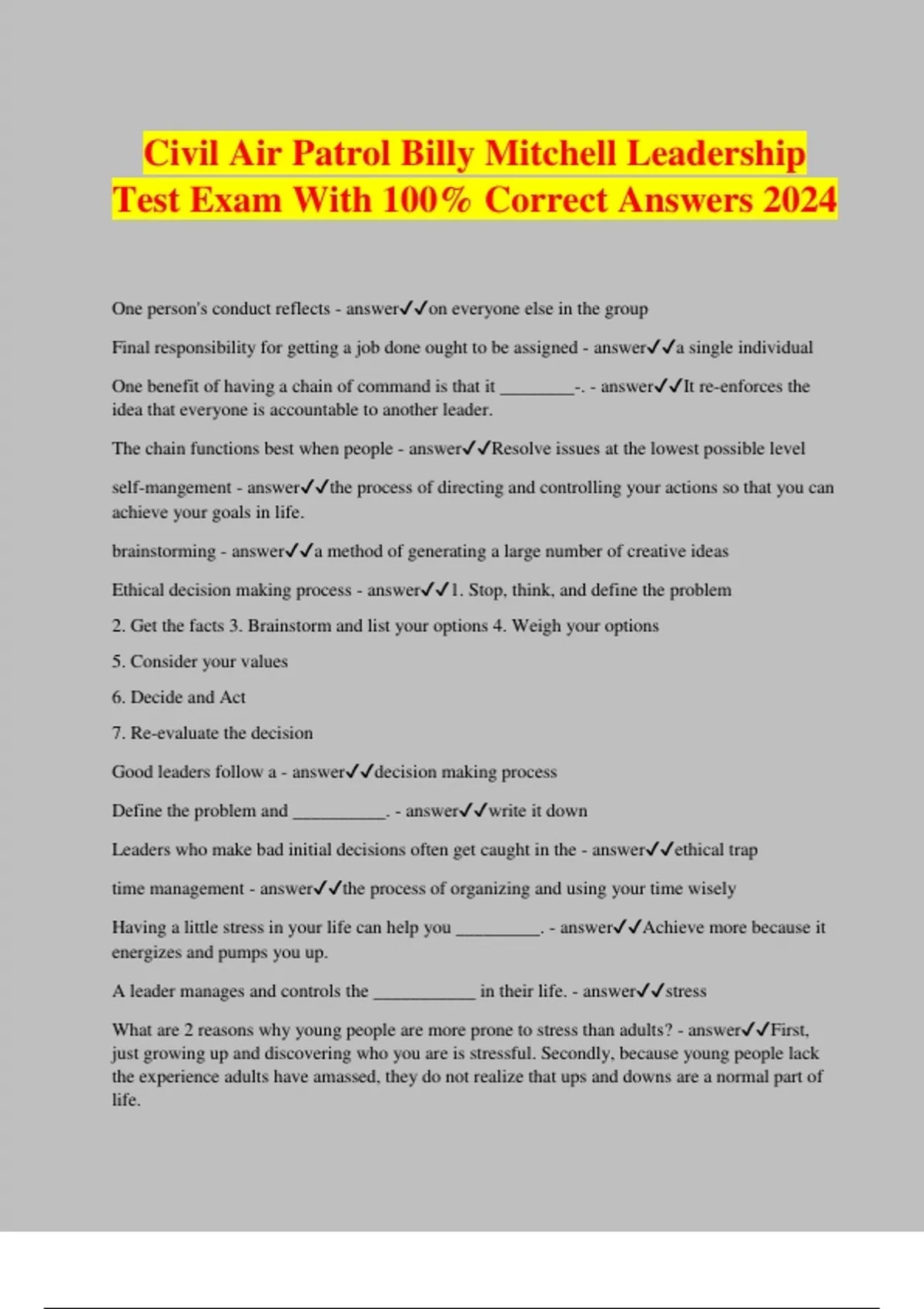 Civil Air Patrol Billy Mitchell Leadership Test Exam With 100% Correct Answers 2024 One person's conduct reflects - answeron everyone else in the group Final responsibility for getting a job done ought to be assigned - answera single individual One benefit of having a chain of command is that it ________-. - answerIt re-enforces the idea that everyone is accountable to another leader. The chain functions best when people - answerResolve issues at the lowest possible level self-mangement - answerthe process of directing and controlling your actions so that you can achieve your goals in life. brainstorming - answera method of generating a large number of creative ideas Ethical decision making process - answer1. Stop, think, and define the problem 2. Get the facts 3. Brainstorm and list your options 4. Weigh your options 5. Consider your values 6. Decide and Act 7. Re-evaluate the decision Good leaders follow a - answerdecision making process Define the problem and __________. - answerwrite it down Leaders who make bad initial decisions often get caught in the - answerethical trap time management - answerthe process of organizing and using your time wisely Having a little stress in your life can help you _________. - answerAchieve more because it energizes and pumps you up. A leader manages and controls the ___________ in their life. - answerstress What are 2 reasons why young people are more prone to stress than adults? - answerFirst, just growing up and discovering who you are is stressful. Secondly, because young people lack the experience adults have amassed, they do not realize that ups and downs are a normal part of life. Resilience - answerThe ability to bounce back and recover from adversity. 7 steps to manage stress - answer1 try and resolve the problem 2 avoid things that bring you down 3 let some things go 4 exercise 5 relax 6 eat well 7 sleep well People who lack coping skills lose their _________. - answerbattles with stress Teens require ___________ hours of sleep per night - answer9-10 Coping skills are especially important for leaders. - answerAs a leader, your ability to exert self-control is always on display A team is a ___________. - answerA collection of individuals who are committed to working together to achieve a common goal. Synergy - answerthe idea that by working together they can achieve more than each individual could on their own. A leader is a ______. - answerprofessional Professionals must have a habit of _______. - answerputting the community's interest above their own The _______ core value shows CAP members