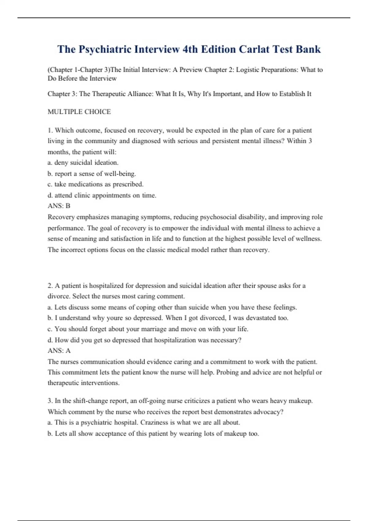The Psychiatric Interview 4th Edition Carlat Test Bank (Chapter 1-Chapter 3)The Initial Interview: A Preview Chapter 2: Logistic Preparations: What to Do Before the Interview Chapter 3: The Therapeutic Alliance: What It Is, Why It's Important, and How to Establish It MULTIPLE CHOICE 1. Which outcome, focused on recovery, would be expected in the plan of care for a patient living in the community and diagnosed with serious and persistent mental illness? Within 3 months, the patient will: a. deny suicidal ideation. b. report a sense of well-being. c. take medications as prescribed. d. attend clinic appointments on time.