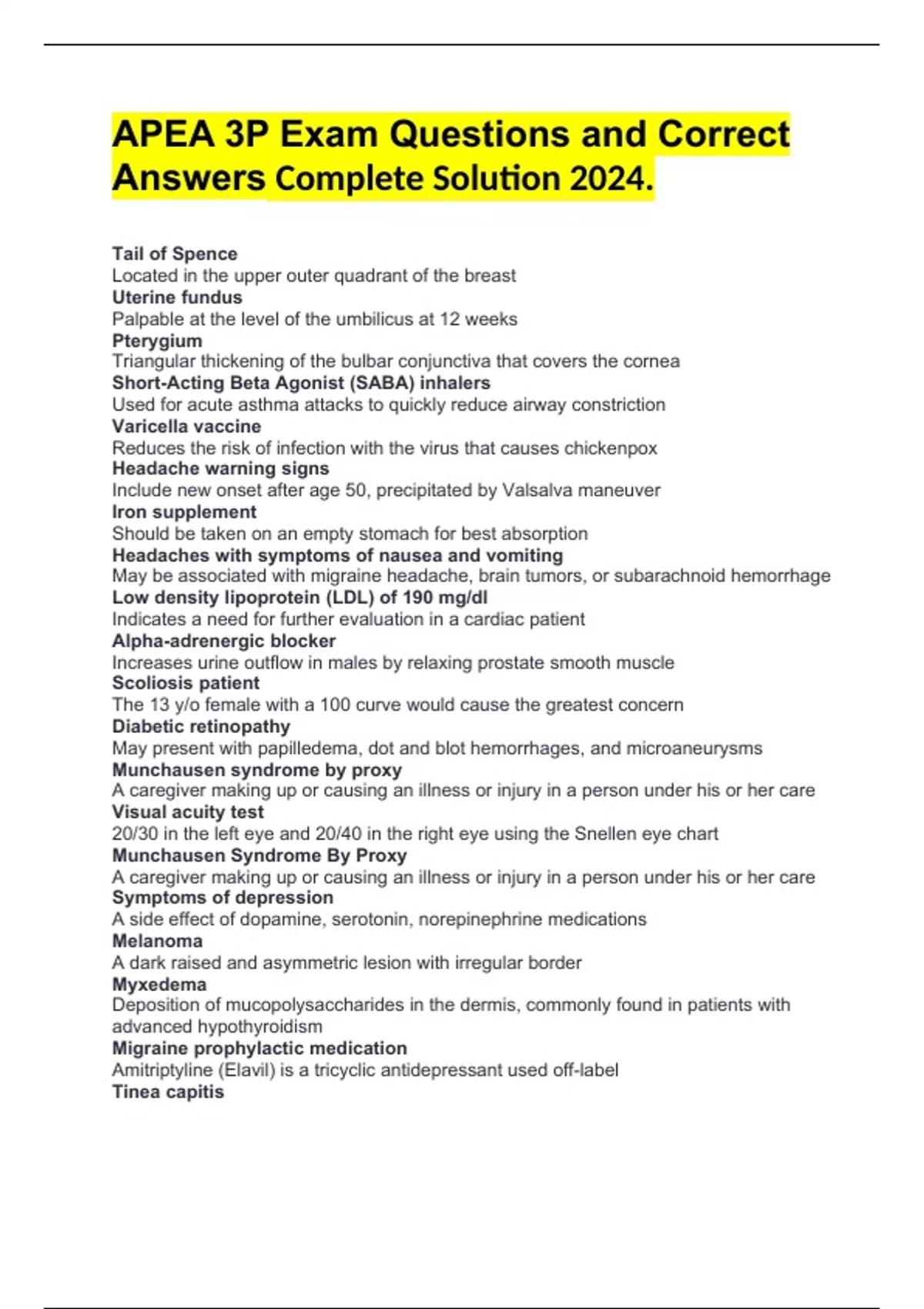 APEA 3P Exam Questions and Correct Answers Complete Solution 2024. Tail of Spence Located in the upper outer quadrant of the breast Uterine fundus Palpable at the level of the umbilicus at 12 weeks Pterygium Triangular thickening of the bulbar conjunctiva that covers the cornea Short-Acting Beta Agonist (SABA) inhalers Used for acute asthma attacks to quickly reduce airway constriction Varicella vaccine Reduces the risk of infection with the virus that causes chickenpox Headache warning signs Include new onset after age 50, precipitated by Valsalva maneuver Iron supplement Should be taken on an empty stomach for best absorption Headaches with symptoms of nausea and vomiting May be associated with migraine headache, brain tumors, or subarachnoid hemorrhage Low density lipoprotein (LDL) of 190 mg/dl Indicates a need for further evaluation in a cardiac patient Alpha-adrenergic blocker Increases urine outflow in males by relaxing prostate smooth muscle Scoliosis patient The 13 y/o female with a 100 curve would cause the greatest concern Diabetic retinopathy May present with papilledema, dot and blot hemorrhages, and microaneurysms Munchausen syndrome by proxy A caregiver making up or causing an illness or injury in a person under his or her care Visual acuity test 20/30 in the left eye and 20/40 in the right eye using the Snellen eye chart Munchausen Syndrome By Proxy A caregiver making up or causing an illness or injury in a person under his or her care Symptoms of depression A side effect of dopamine, serotonin, norepinephrine medications Melanoma A dark raised and asymmetric lesion with irregular border Myxedema Deposition of mucopolysaccharides in the dermis, commonly found in patients with advanced hypothyroidism Migraine prophylactic medication Amitriptyline (Elavil) is a tricyclic antidepressant used off-label Tinea capitis