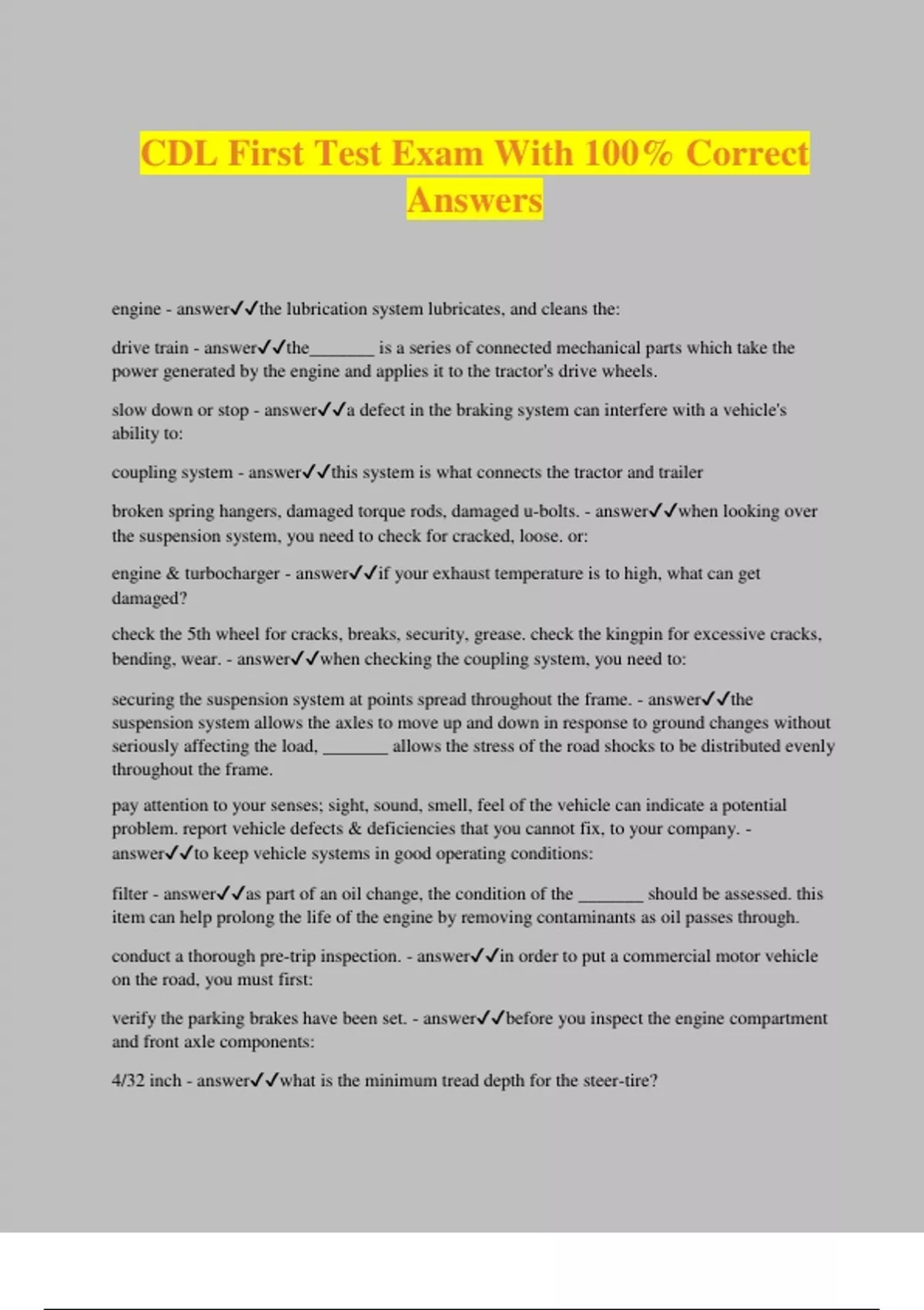 CDL First Test Exam With 100% Correct Answers engine - answerthe lubrication system lubricates, and cleans the: drive train - answerthe_______ is a series of connected mechanical parts which take the power generated by the engine and applies it to the tractor's drive wheels. slow down or stop - answera defect in the braking system can interfere with a vehicle's ability to: coupling system - answerthis system is what connects the tractor and trailer broken spring hangers, damaged torque rods, damaged u-bolts. - answerwhen looking over the suspension system, you need to check for cracked, loose. or: engine & turbocharger - answerif your exhaust temperature is to high, what can get damaged? check the 5th wheel for cracks, breaks, security, grease. check the kingpin for excessive cracks, bending, wear. - answerwhen checking the coupling system, you need to: securing the suspension system at points spread throughout the frame. - answerthe suspension system allows the axles to move up and down in response to ground changes without seriously affecting the load, _______ allows the stress of the road shocks to be distributed evenly throughout the frame. pay attention to your senses; sight, sound, smell, feel of the vehicle can indicate a potential problem. report vehicle defects & deficiencies that you cannot fix, to your company. - answerto keep vehicle systems in good operating conditions: filter - answeras part of an oil change, the condition of the _______ should be assessed. this item can help prolong the life of the engine by removing contaminants as oil passes through. conduct a thorough pre-trip inspection. - answerin order to put a commercial motor vehicle on the road, you must first: verify the parking brakes have been set. - answerbefore you inspect the engine compartment and front axle components: 4/32 inch - answerwhat is the minimum tread depth for the steer-tire? the break shoes have at least a quarter- inch lining. - answerwhen inspecting the brake assembly, you should ensure: whenever a change of duty status is made, every three hours, or 150 miles, whichever comes first. - answerafter the initial 50-mile check, how often must you conduct additional on the road inspections of the cargo securement & securement deviices? if you load is sealed and you have been ordered not to open it. if you vehicle is loaded in a way that makes cargo inspection impossible - answerwhat is the only circumstance you are not required to inspect you cargo and load securing devices? at the end of every workday - answerwhen is it appropriate to conduct a post trip ins