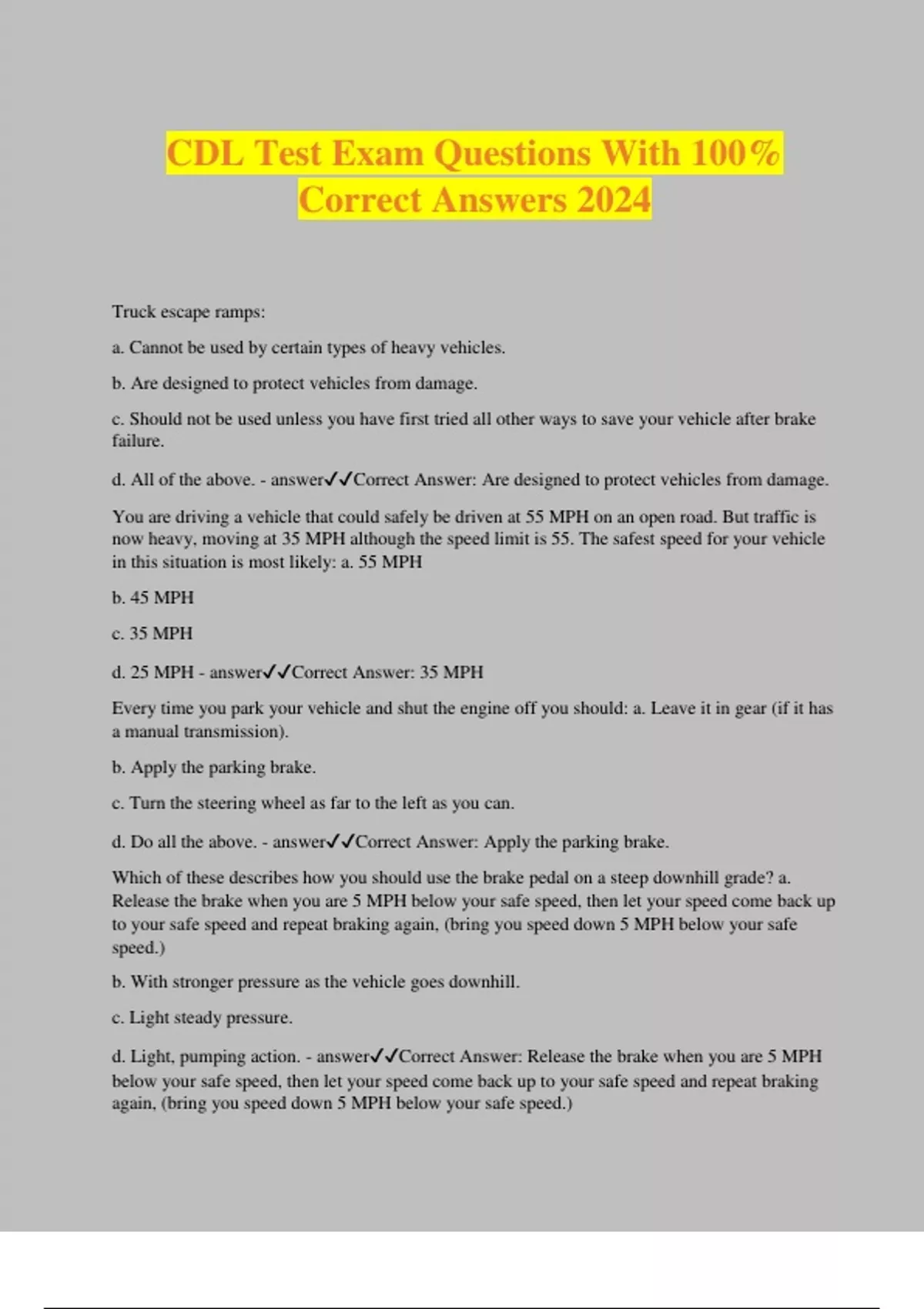 CDL Test Exam Questions With 100% Correct Answers 2024 Truck escape ramps: a. Cannot be used by certain types of heavy vehicles. b. Are designed to protect vehicles from damage. c. Should not be used unless you have first tried all other ways to save your vehicle after brake failure. d. All of the above. - answerCorrect Answer: Are designed to protect vehicles from damage. You are driving a vehicle that could safely be driven at 55 MPH on an open road. But traffic is now heavy, moving at 35 MPH although the speed limit is 55. The safest speed for your vehicle in this situation is most likely: a. 55 MPH b. 45 MPH c. 35 MPH d. 25 MPH - answerCorrect Answer: 35 MPH Every time you park your vehicle and shut the engine off you should: a. Leave it in gear (if it has a manual transmission). b. Apply the parking brake. c. Turn the steering wheel as far to the left as you can. d. Do all the above. - answerCorrect Answer: Apply the parking brake. Which of these describes how you should use the brake pedal on a steep downhill grade? a. Release the brake when you are 5 MPH below your safe speed, then let your speed come back up to your safe speed and repeat braking again, (bring you speed down 5 MPH below your safe speed.) b. With stronger pressure as the vehicle goes downhill. c. Light steady pressure. d. Light, pumping action. - answerCorrect Answer: Release the brake when you are 5 MPH below your safe speed, then let your speed come back up to your safe speed and repeat braking again, (bring you speed down 5 MPH below your safe speed.) For an average commercial vehicle, being driven at 55 MPH on dry pavement it will take about ____ to bring the vehicle to a stop. a. The length of a vehicle. b. Half the length of a football field. c. Twice the length of the vehicle. d. The length of a football field. - answerCorrect Answer: The length of a football field. Which of these statements about certain types of cargo is true? a. Oversize loads can be hauled without special permits during times when the roads are not busy. b. When liquids are hauled, the tank should always be loaded totally full. c. Unstable loads such as hanging meat or livestock require extra caution on curves. d. Loads that consist of liquids in bulk do not present vehicle handling problems because they are usually very heavy. - answerCorrect Answer: Unstable loads such as hanging meat or livestock require extra caution on curves. Which of these statements about backing a heavy vehicle is true? a. Backing is always dangerous. Which of these statements about backing a heavy vehicle is true? a. Backing is always dangerous. b. You should back and turn toward the driver's side whenever possible. c. You should use a helper and communicate with hand signals. d. All of the above are true. - answerCorrect Answer: Backing is always dangerous. When should you wear seat belts? a. Only in states where it is required by law. b. Any time you are in a moving vehicle. c. Only when engaged in interstate commerce. d. Only when traveling on a highway. - answerCorrect Answer: Any time you are in a moving vehicle. The most common cause of serious vehicle skids is: a. The most common cause of serious vehicle skids is: a. Driving too fast for road conditions. b. Poorly designed roads. c. Poorly adjusted brakes. d. Poorly adjusted brakes. - answerCorrect Answer: Driving too fast for road conditions. If you are being tailgated, you should: a. Signal the tailgater when it is safe to pass. b. Speed up. c. Flash your brake lights. d. Increase the space in front of you. - answerCorrect Answer: Increase the space in front of you. The parking brake should be tested while the vehicle is: a. Moving slowly. b. Moving at highway speed. c. Going downhill. d. Parked - answerCorrect Answer: Parked A drivers trip log, if required: a. May be brought up to date once a week. b. Is also called a c. Must be shown immediately when an officer requests it. d. All of the above. - answerCorrect Answer: Mu