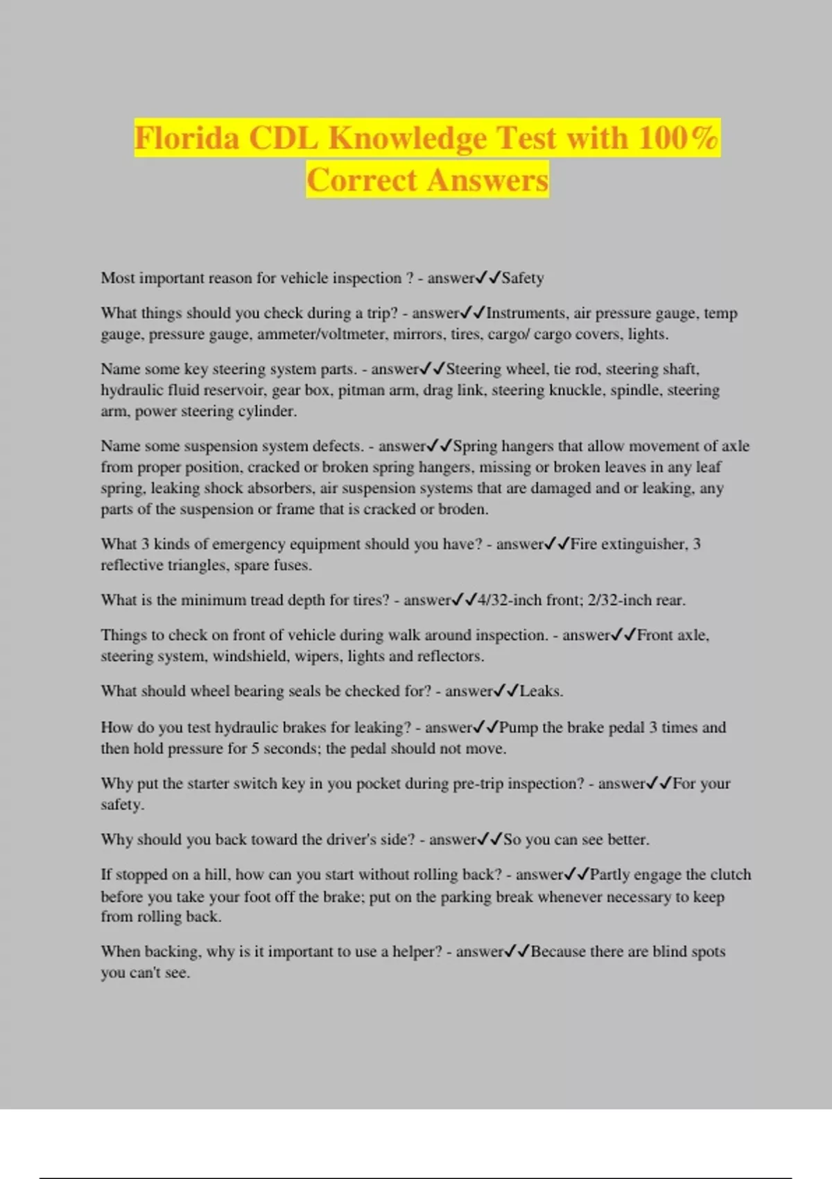 Florida CDL Knowledge Test with 100% Correct Answers Most important reason for vehicle inspection ? - answerSafety What things should you check during a trip? - answerInstruments, air pressure gauge, temp gauge, pressure gauge, ammeter/voltmeter, mirrors, tires, cargo/ cargo covers, lights. Name some key steering system parts. - answerSteering wheel, tie rod, steering shaft, hydraulic fluid reservoir, gear box, pitman arm, drag link, steering knuckle, spindle, steering arm, power steering cylinder. Name some suspension system defects. - answerSpring hangers that allow movement of axle from proper position, cracked or broken spring hangers, missing or broken leaves in any leaf spring, leaking shock absorbers, air suspension systems that are damaged and or leaking, any parts of the suspension or frame that is cracked or broden. What 3 kinds of emergency equipment should you have? - answerFire extinguisher, 3 reflective triangles, spare fuses. What is the minimum tread depth for tires? - answer4/32-inch front; 2/32-inch rear. Things to check on front of vehicle during walk around inspection. - answerFront axle, steering system, windshield, wipers, lights and reflectors. What should wheel bearing seals be checked for? - answerLeaks. How do you test hydraulic brakes for leaking? - answerPump the brake pedal 3 times and then hold pressure for 5 seconds; the pedal should not move. Why put the starter switch key in you pocket during pre-trip inspection? - answerFor your safety. Why should you back toward the driver's side? - answerSo you can see better. If stopped on a hill, how can you start without rolling back? - answerPartly engage the clutch before you take your foot off the brake; put on the parking break whenever necessary to keep from rolling back. When backing, why is it important to use a helper? - answerBecause there are blind spots you can't see. What's the most important hand signal that you and the helper should agree on? - answerStop. What are 2 special conditions where you should downshift? - answerBefore starting down a hill; before entering a curve. When should you downshift an automatic transmission? - answerWhen going down grades. Retarders keep you from skidding when the road is slippery. T/F? - answerFalse What are the 2 ways to know when to shift? - answerEngine RPM's or road speed. How far ahead does the manual say you should look? - answer12 to 15 seconds. What are 2 main things to look for ahead? - answerLook for vehicles coming onto the highway, into your lane, or turning. Watch for brake lights from slowing vehicles. What's your most important way to see the sides and rear of your vehicle? - answerMirrors. What does "communicating" mean in safe driving? - answerSignaling your intentions. Where should your reflectors be placed when stopped on a divided highway? - answer10 feet, 100 feet, and 200 feet toward the approach