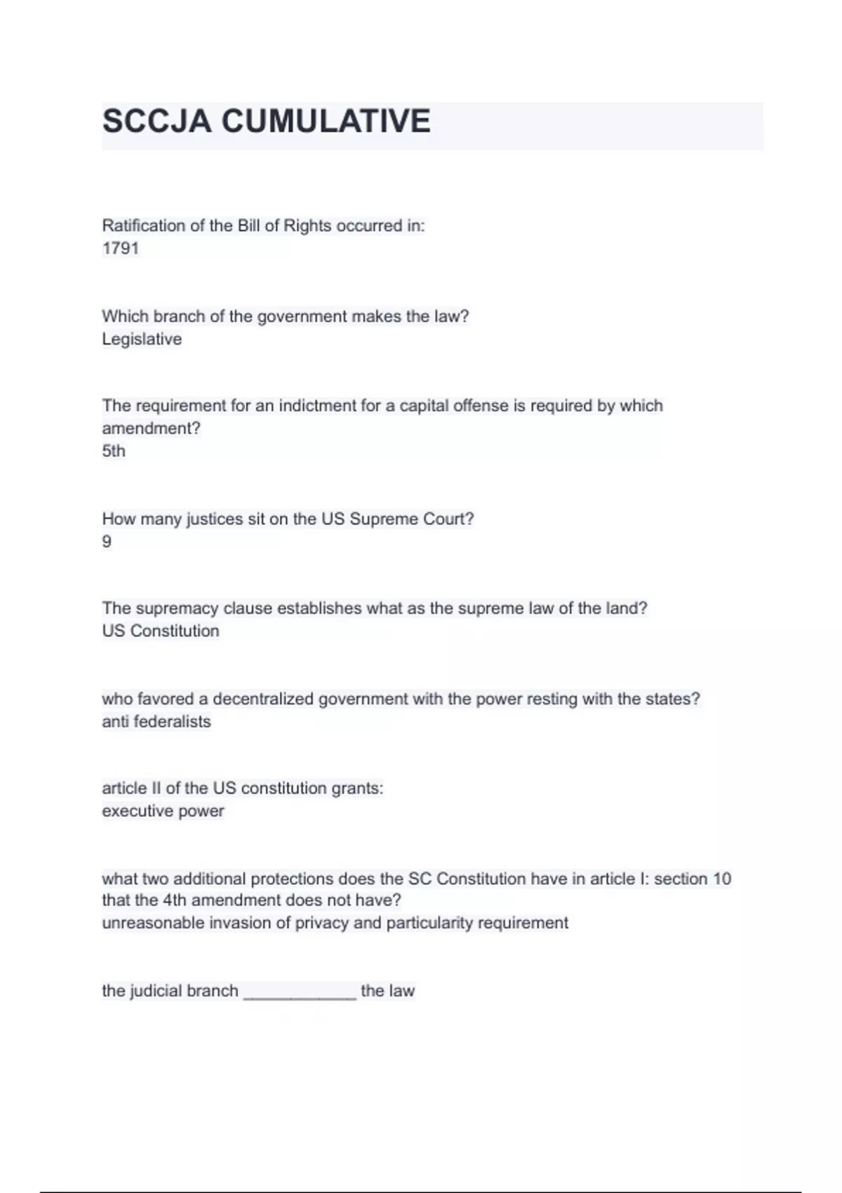 SCCJA CUMULATIVE EXAM QUESTIONS WITH CORRECT VERIFIED ANSWERS Ratification of the Bill of Rights occurred in: 1791 Which branch of the government makes the law? Legislative The requirement for an indictment for a capital offense is required by which amendment? 5th How many justices sit on the US Supreme Court? 9 The supremacy clause establishes what as the supreme law of the land? US Constitution who favored a decentralized government with the power resting with the states? anti federalists article II of the US constitution grants: executive power what two additional protections does the SC Constitution have in article I: section 10 that the 4th amendment does not have? unreasonable invasion of privacy and particularity requirement the judicial branch ____________ the law interprets Sir Robert Peel drafted ___________ Principles in 1829 that are relevant for today's law enforcement officer 9 Peel stated that the basic mission of law enforcement is to _______ as an alternative to _________? prevent crime and disorder; using military force to repress crime according to Peel, what is the test of police efficiency? absence of crime and disorder what was established to operate as a restriction on the national government? Bill of Rights "the conduct of legal proceedings according to established rules and principles for the protection and enforcement of private rights, including notice and the right to a fair hearing before tribunal with the power to decide the case" the 14th amendment due process the US supreme court was ordained by the US constitution in: article III, section I what is the compulsory process for obtaining witnesses as listed in the 6th amendment? the power to subpoena only fully published opinions can serve as case law (T/F) true "excessive bail shall not be required, nor excessive fines imposed, nor cruel punishment inflicted" 8th amendment