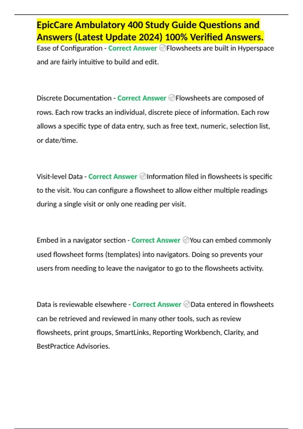 EpicCare Ambulatory 400 Study Guide Questions and Answers (Latest Update 2024) 100% Verified Answers.