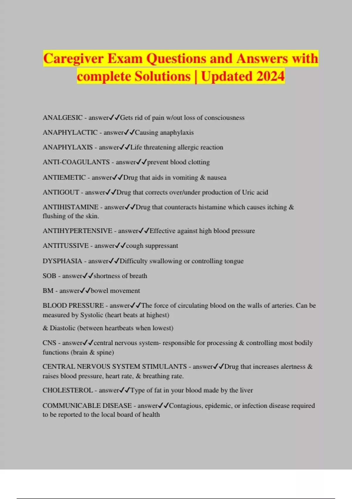 Caregiver Exam Questions and Answers with complete Solutions | Updated 2024 ANALGESIC - answerGets rid of pain w/out loss of consciousness ANAPHYLACTIC - answerCausing anaphylaxis ANAPHYLAXIS - answerLife threatening allergic reaction ANTI-COAGULANTS - answerprevent blood clotting ANTIEMETIC - answerDrug that aids in vomiting & nausea ANTIGOUT - answerDrug that corrects over/under production of Uric acid ANTIHISTAMINE - answerDrug that counteracts histamine which causes itching & flushing of the skin. ANTIHYPERTENSIVE - answerEffective against high blood pressure ANTITUSSIVE - answercough suppressant DYSPHASIA - answerDifficulty swallowing or controlling tongue SOB - answershortness of breath BM - answerbowel movement BLOOD PRESSURE - answerThe force of circulating blood on the walls of arteries. Can be measured by Systolic (heart beats at highest) & Diastolic (between heartbeats when lowest) CNS - answercentral nervous system- responsible for processing & controlling most bodily functions (brain & spine) CENTRAL NERVOUS SYSTEM STIMULANTS - answerDrug that increases alertness & raises blood pressure, heart rate, & breathing rate. CHOLESTEROL - answerType of fat in your blood made by the liver COMMUNICABLE DISEASE - answerContagious, epidemic, or infection disease required to be reported to the local board of health CONGESTIVE HEART FAILURE (CHF) - answerFailure of the heart to keep up & blood flow to organs with normal efficiency (Common symptom edema) CORONARY ARTERY DISEASE - answerdisease that causes blockage of arteries that supply blood to the heart usually c