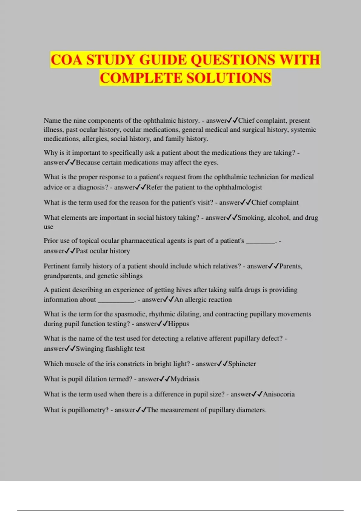 COA STUDY GUIDE QUESTIONS WITH COMPLETE SOLUTIONS Name the nine components of the ophthalmic history. - answerChief complaint, present illness, past ocular history, ocular medications, general medical and surgical history, systemic medications, allergies, social history, and family history. Why is it important to specifically ask a patient about the medications they are taking? - answerBecause certain medications may affect the eyes. What is the proper response to a patient's request from the ophthalmic technician for medical advice or a diagnosis? - answerRefer the patient to the ophthalmologist What is the term used for the reason for the patient's visit? - answerChief complaint What elements are important in social history taking? - answerSmoking, alcohol, and drug use Prior use of topical ocular pharmaceutical agents is part of a patient's ________. - answerPast ocular history Pertinent family history of a patient should include which relatives? - answerParents, grandparents, and genetic siblings A patient describing an experience of getting hives after taking sulfa drugs is providing information about __________. - answerAn allergic reaction What is the term for the spasmodic, rhythmic dilating, and contracting pupillary movements during pupil function testing? - answerHippus What is the name of the test used for detecting a relative afferent pupillary defect? - answerSwinging flashlight test Which muscle of the iris constricts in bright light? - answerSphincter What is pupil dilation termed? - answerMydriasis What is the term used when there is a difference in pupil size? - answerAnisocoria What is pupillometry? - answerThe measurement of pupillary diameters. What is the name of the reflexive reaction that occurs when a light is directed into one pupil and the pupil of the opposite eye simultaneously reacts - answerConsensual pupillary reaction Calibration of the applanation tonometer should be checked approximately every _____ months. - answerTwo (or sooner with regular use) When cleaning the goniolens, what is uses to rinse off the methycellulose? - answerWarm running water When replacing a light bulb _____ can diminish its effectiveness and life. - answerOil from fingers Diagnostic lenses that contact the eye can be sterilized using? - answerEthylene Oxide gas How should the removable glass slides inside the American Optical acuity projector be cleaned? - answerWipe with clean, soft lint-free towel or photographic lens paper If dust accumulates on the mirror of the slit lamp, the technician may clean it by using what cleaning methods? - answerA lint-free cloth, a lens brush, or a blast of air Who should repair and maintain equipment such as a laser? - answerA qualified service technician. Which accessories are used to check the calibration of an ophthalmometer/keratometer? - answerThree test balls made of steel also