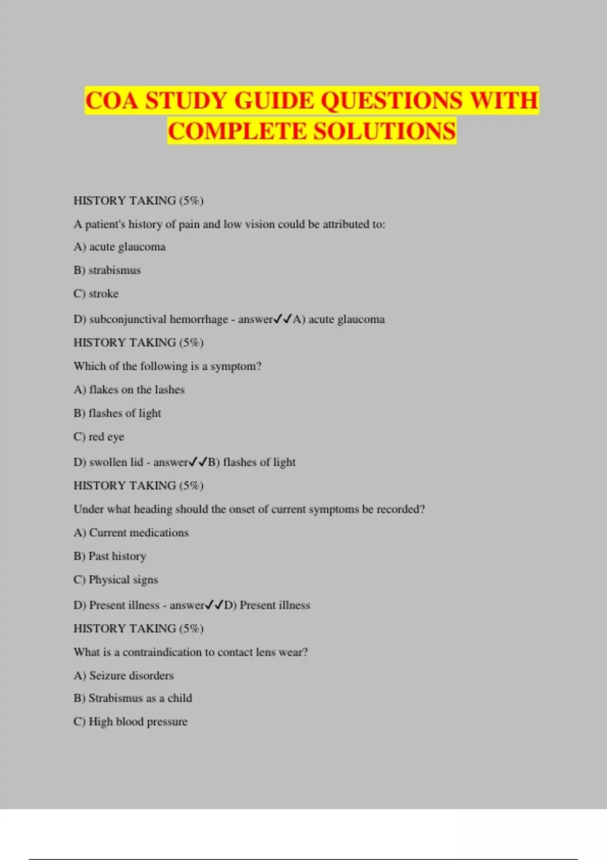 COA STUDY GUIDE QUESTIONS WITH COMPLETE SOLUTIONS HISTORY TAKING (5%) A patient's history of pain and low vision could be attributed to: A) acute glaucoma B) strabismus C) stroke D) subconjunctival hemorrhage - answerA) acute glaucoma HISTORY TAKING (5%) Which of the following is a symptom? A) flakes on the lashes B) flashes of light C) red eye D) swollen lid - answerB) flashes of light HISTORY TAKING (5%) Under what heading should the onset of current symptoms be recorded? A) Current medications B) Past history C) Physical signs D) Present illness - answerD) Present illness HISTORY TAKING (5%) What is a contraindication to contact lens wear? A) Seizure disorders B) Strabismus as a child C) High blood pressure D) Cataracts - answerA) Seizure disorders HISTORY TAKING (5%) Which is the main reason for the patient's visit to the ophthalmologist recorded? A) Chief complaint B) Family History C) Past medical history D) Past ocular history - answerA) Chief complaint VISUAL ASSESSMENT (6%) What is a probable cause of blurred distance vision that is improved by squinting? A) Esotropia B) Glaucoma C) Uncorrected myopia D) Uncorrected presbyopia - answerC) Uncorrected myopia VISUAL ASSESSMENT (6%) Which of the following equivalencies is correct? A) 5/200 is equivalent to 20/400 B) 6/60 is equivalent to 3/120 C) 10/200 is equivalent to 20/100 D) 20/200 is equivalent to 10/100 - answerD) 20/200 is equivalent to 10/100 VISUAL ASSESSMENT (6%) Which of the following is a measure of distance of visual acuity? A) 20/20 B) 40 arc seconds C) D-15 D) Jaeger 2 - answerA) 20/20 VISUAL ASSESSMENT (6%) 20/60 visual acuity means the patient sees a test object at: A) 6 meters that someone with 20/20