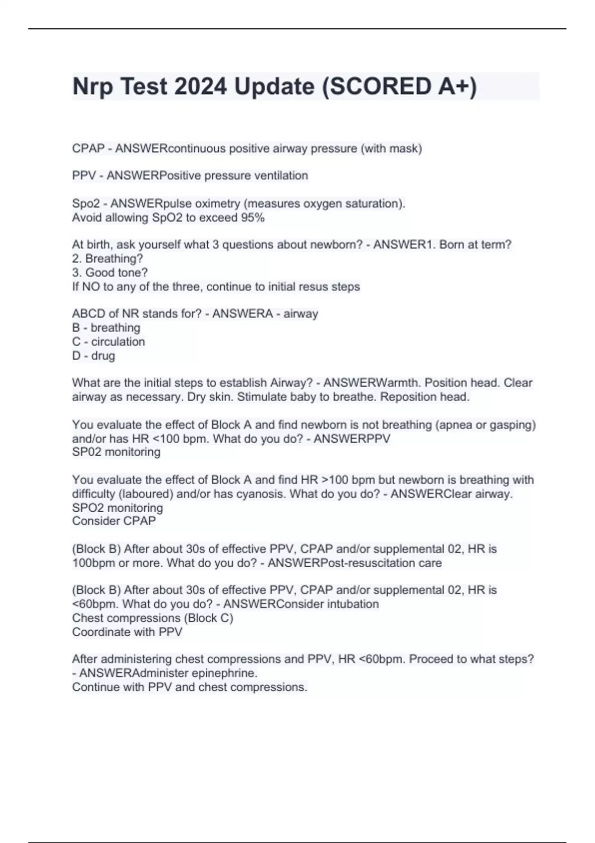 CPAP - ANSWERcontinuous positive airway pressure (with mask) PPV - ANSWERPositive pressure ventilation Spo2 - ANSWERpulse oximetry (measures oxygen saturation). Avoid allowing SpO2 to exceed 95% At birth, ask yourself what 3 questions about newborn? - ANSWER1. Born at term? 2. Breathing? 3. Good tone? If NO to any of the three, continue to initial resus steps ABCD of NR stands for? - ANSWERA - airway B - breathing C - circulation D - drug What are the initial steps to establish Airway? - ANSWERWarmth. Position head. Clear airway as necessary. Dry skin. Stimulate baby to breathe. Reposition head. You evaluate the effect of Block A and find newborn is not breathing (apnea or gasping) and/or has HR <100 bpm. What do you do? - ANSWERPPV SP02 monitoring You evaluate the effect of Block A and find HR >100 bpm but newborn is breathing with difficulty (laboured) and/or has cyanosis. What do you do? - ANSWERClear airway. SPO2 monitoring Consider CPAP