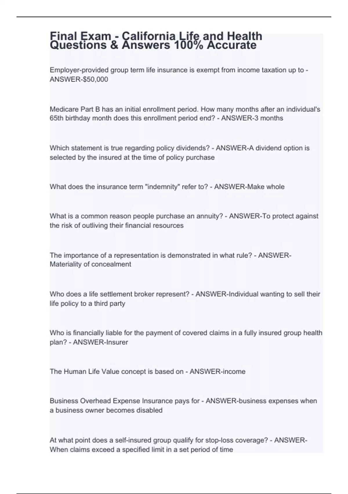 Employer-provided group term life insurance is exempt from income taxation up to - ANSWER-$50,000 Medicare Part B has an initial enrollment period. How many months after an individual's 65th birthday month does this enrollment period end? - ANSWER-3 months Which statement is true regarding policy dividends? - ANSWER-A dividend option is selected by the insured at the time of policy purchase What does the insurance term "indemnity" refer to? - ANSWER-Make whole What is a common reason people purchase an annuity? - ANSWER-To protect against the risk of outliving their financial resources The importance of a representation is demonstrated in what rule? - ANSWER-Materiality of concealment Who does a life settlement broker represent? - ANSWER-Individual wanting to sell their life policy to a third party Who is financially liable for the payment of covered claims in a fully insured group health plan? - ANSWER-Insurer The Human Life Value concept is based on - ANSWER-income Business Overhead Expense Insurance pays for - ANSWER-business expenses when a business owner becomes disabled At what point does a self-insured group qualify for stop-loss coverage? - ANSWER-When claims exceed a specified limit in a set period of time