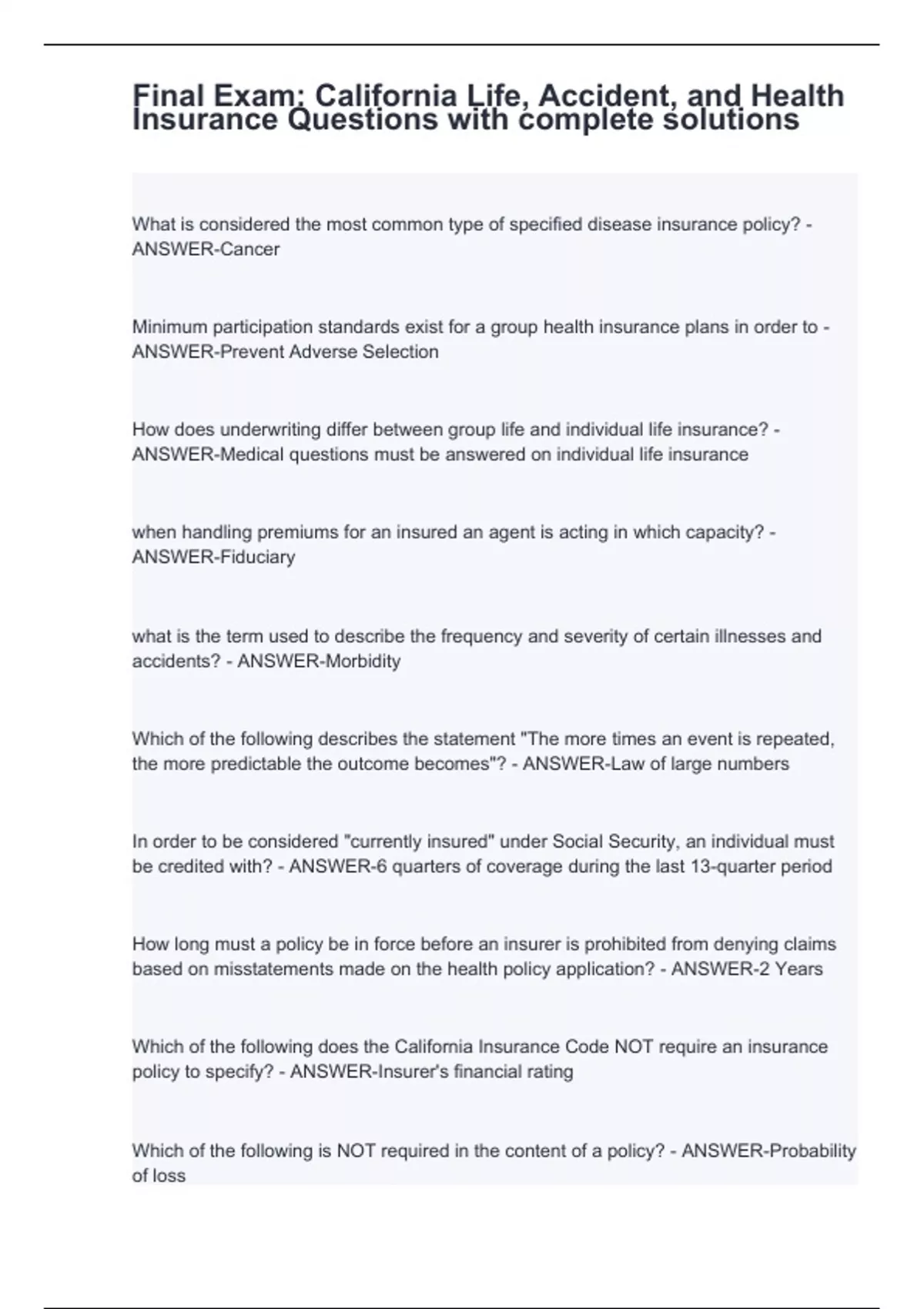 What is considered the most common type of specified disease insurance policy? - ANSWER-Cancer Minimum participation standards exist for a group health insurance plans in order to - ANSWER-Prevent Adverse Selection How does underwriting differ between group life and individual life insurance? - ANSWER-Medical questions must be answered on individual life insurance when handling premiums for an insured an agent is acting in which capacity? - ANSWER-Fiduciary what is the term used to describe the frequency and severity of certain illnesses and accidents? - ANSWER-Morbidity Which of the following describes the statement "The more times an event is repeated, the more predictable the outcome becomes"? - ANSWER-Law of large numbers In order to be considered "currently insured" under Social Security, an individual must be credited with? - ANSWER-6 quarters of coverage during the last 13-quarter period How long must a policy be in force before an insurer is prohibited from denying claims based on misstatements made on the health policy application? - ANSWER-2 Years Which of the following does the California Insurance Code NOT require an insurance policy to specify? - ANSWER-Insurer's financial rating