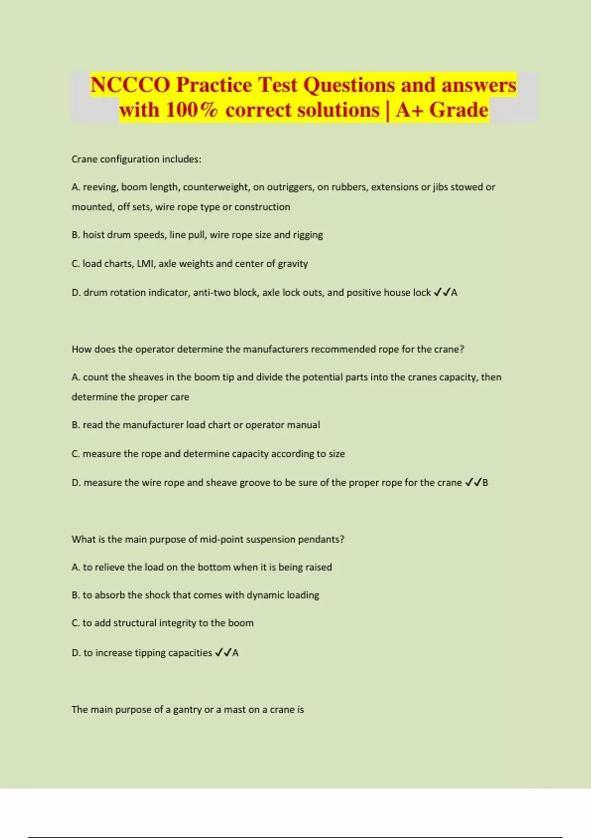 Crane configuration includes: A. reeving, boom length, counterweight, on outriggers, on rubbers, extensions or jibs stowed or mounted, off sets, wire rope type or construction B. hoist drum speeds, line pull, wire rope size and rigging C. load charts, LMI, axle weights and center of gravity D. drum rotation indicator, anti-two block, axle lock outs, and positive house lock A How does the operator determine the manufacturers recommended rope for the crane? A. count the sheaves in the boom tip and divide the potential parts into the cranes capacity, then determine the proper care B. read the manufacturer load chart or operator manual C. measure the rope and determine capacity according to size D. measure the wire rope and sheave groove to be sure of the proper rope for the crane B What is the main purpose of mid-point suspension pendants? A. to relieve the load on the bottom when it is being raised B. to absorb the shock that comes with dynamic loading C. to add structural integrity to the boom D. to increase tipping capacities A