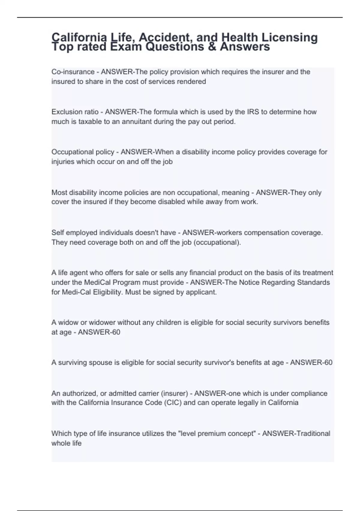 Co-insurance - ANSWER-The policy provision which requires the insurer and the insured to share in the cost of services rendered Exclusion ratio - ANSWER-The formula which is used by the IRS to determine how much is taxable to an annuitant during the pay out period. Occupational policy - ANSWER-When a disability income policy provides coverage for injuries which occur on and off the job Most disability income policies are non occupational, meaning - ANSWER-They only cover the insured if they become disabled while away from work. Self employed individuals doesn't have - ANSWER-workers compensation coverage. They need coverage both on and off the job (occupational). A life agent who offers for sale or sells any financial product on the basis of its treatment under the MediCal Program must provide - ANSWER-The Notice Regarding Standards for Medi-Cal Eligibility. Must be signed by applicant. A widow or widower without any children is eligible for social security survivors benefits at age - ANSWER-60 A surviving spouse is eligible for social security survivor's benefits at age - ANSWER-60 An authorized, or admitted carrier (insurer) - ANSWER-one which is under compliance with the California Insurance Code (CIC) and can operate legally in California Which type of life insurance utilizes the "level premium concept" - ANSWER-Traditional whole life
