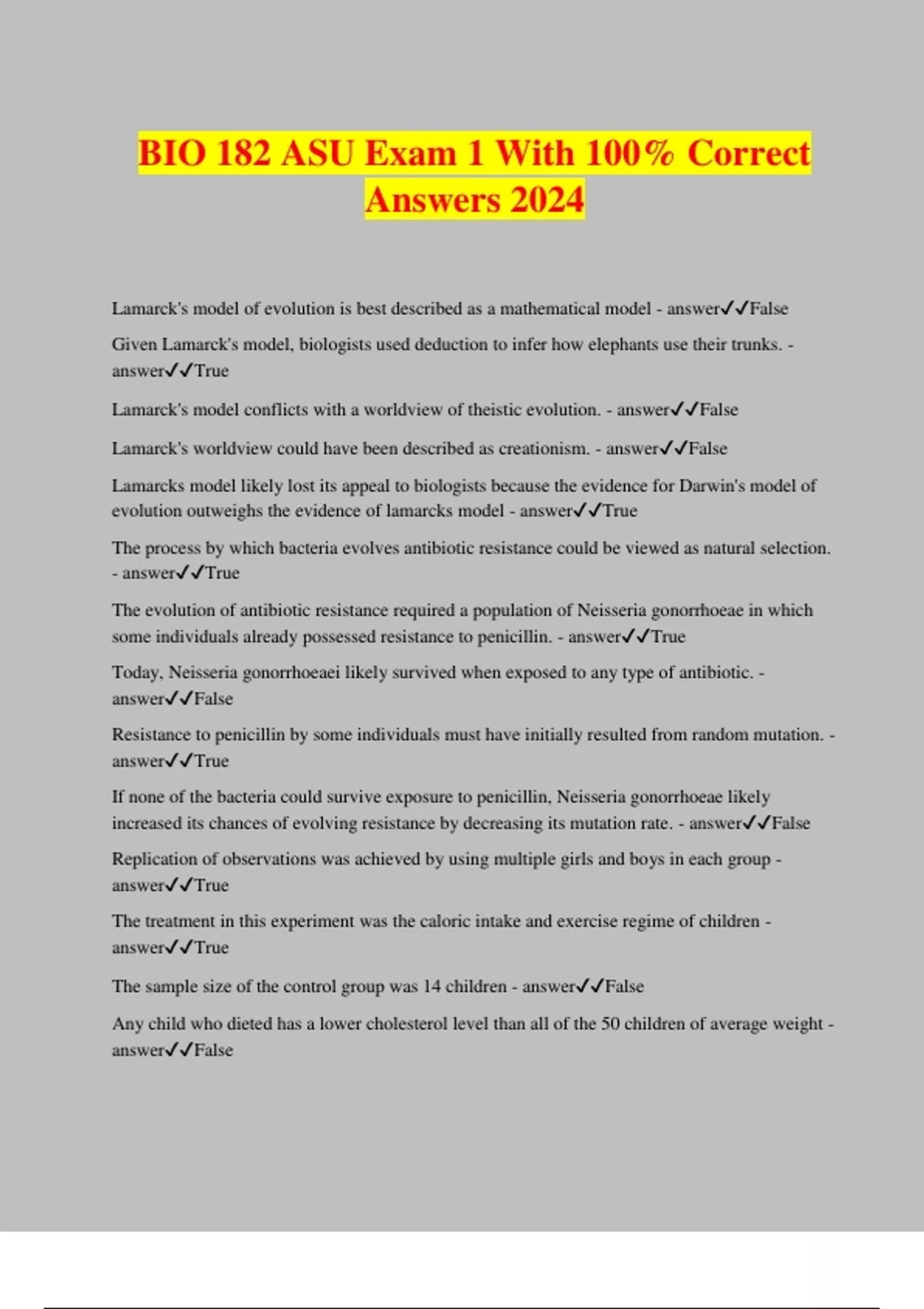 BIO 182 ASU Exam 1 With 100% Correct Answers 2024 Lamarck's model of evolution is best described as a mathematical model - answerFalse Given Lamarck's model, biologists used deduction to infer how elephants use their trunks. - answerTrue Lamarck's model conflicts with a worldview of theistic evolution. - answerFalse Lamarck's worldview could have been described as creationism. - answerFalse Lamarcks model likely lost its appeal to biologists because the evidence for Darwin's model of evolution outweighs the evidence of lamarcks model - answerTrue The process by which bacteria evolves antibiotic resistance could be viewed as natural selection. - answerTrue The evolution of antibiotic resistance required a population of Neisseria gonorrhoeae in which some individuals already possessed resistance to penicillin. - answerTrue Today, Neisseria gonorrhoeaei likely survived when exposed to any type of antibiotic. - answerFalse Resistance to penicillin by some individuals must have initially resulted from random mutation. - answerTrue If none of the bacteria could survive exposure to penicillin, Neisseria gonorrhoeae likely increased its chances of evolving resistance by decreasing its mutation rate. - answerFalse Replication of observations was achieved by using multiple girls and boys in each group - answerTrue The treatment in this experiment was the caloric intake and exercise regime of children - answerTrue The sample size of the control group was 14 children - answerFalse Any child who dieted has a lower cholesterol level than all of the 50 children of average weight - answerFalse The experiment would have been improved if the researchers had included a control group of overweight children who neither dieted nor exercised during the three weeks - answerTrue If a tall person mated with a short person, their offspring would likely be intermediate in height - answerTrue Alleles that cause shorter heigh