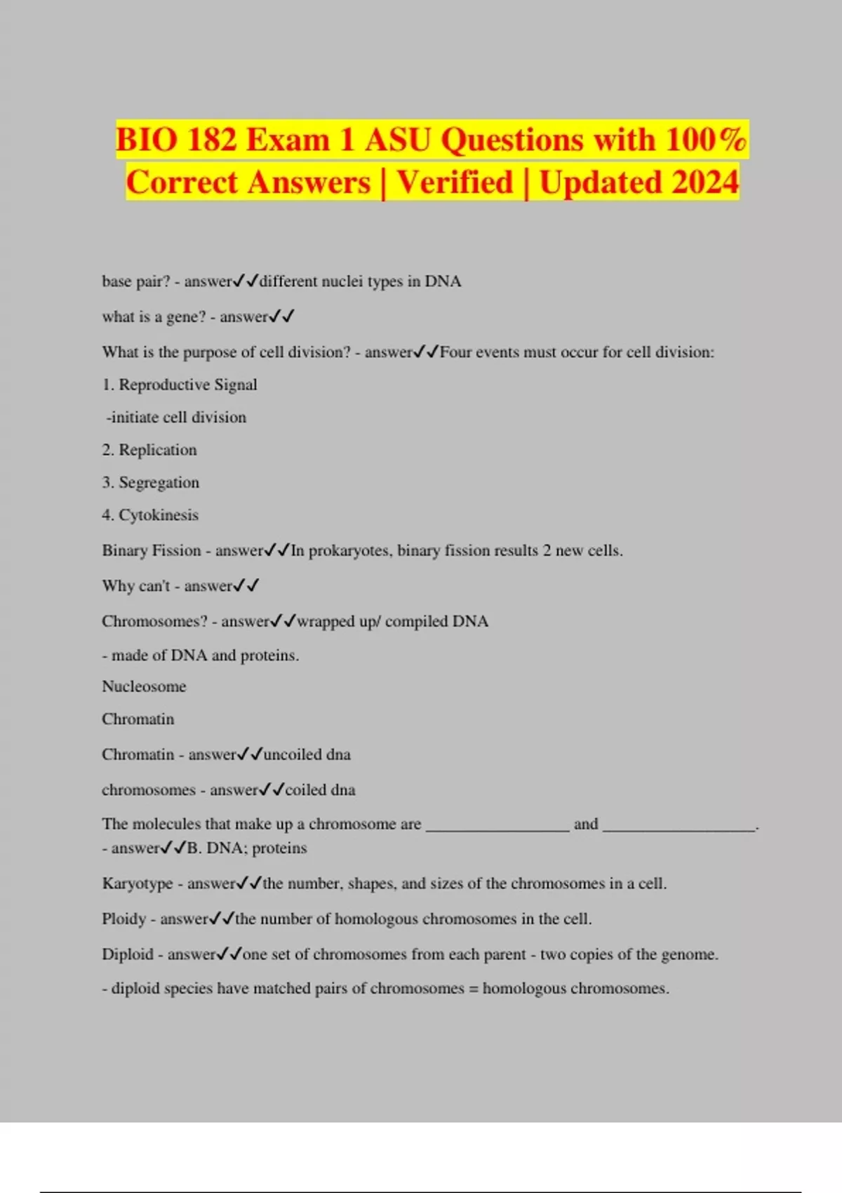 BIO 182 Exam 1 ASU Questions with 100% Correct Answers | Verified | Updated 2024 base pair? - answerdifferent nuclei types in DNA what is a gene? - answer What is the purpose of cell division? - answerFour events must occur for cell division: 1. Reproductive Signal -initiate cell division 2. Replication 3. Segregation 4. Cytokinesis Binary Fission - answerIn prokaryotes, binary fission results 2 new cells. Why can't - answer Chromosomes? - answerwrapped up/ compiled DNA - made of DNA and proteins. Nucleosome Chromatin Chromatin - answeruncoiled dna chromosomes - answercoiled dna The molecules that make up a chromosome are _________________ and __________________. - answerB. DNA; proteins Karyotype - answerthe number, shapes, and sizes of the chromosomes in a cell. Ploidy - answerthe number of homologous chromosomes in the cell. Diploid - answerone set of chromosomes from each parent - two copies of the genome. - diploid species have matched pairs of chromosomes = homologous chromosomes. Haploid - answerthe number of chromosomes in a gamete (sperm or egg) only one copy of genome. Homologous Chromosomes - answera pair of chromosomes. Goal of mitosis - answermove identical genetic info into 2 new cells. A diploid cell entering mitosis - answer- 3 pairs of chromosom