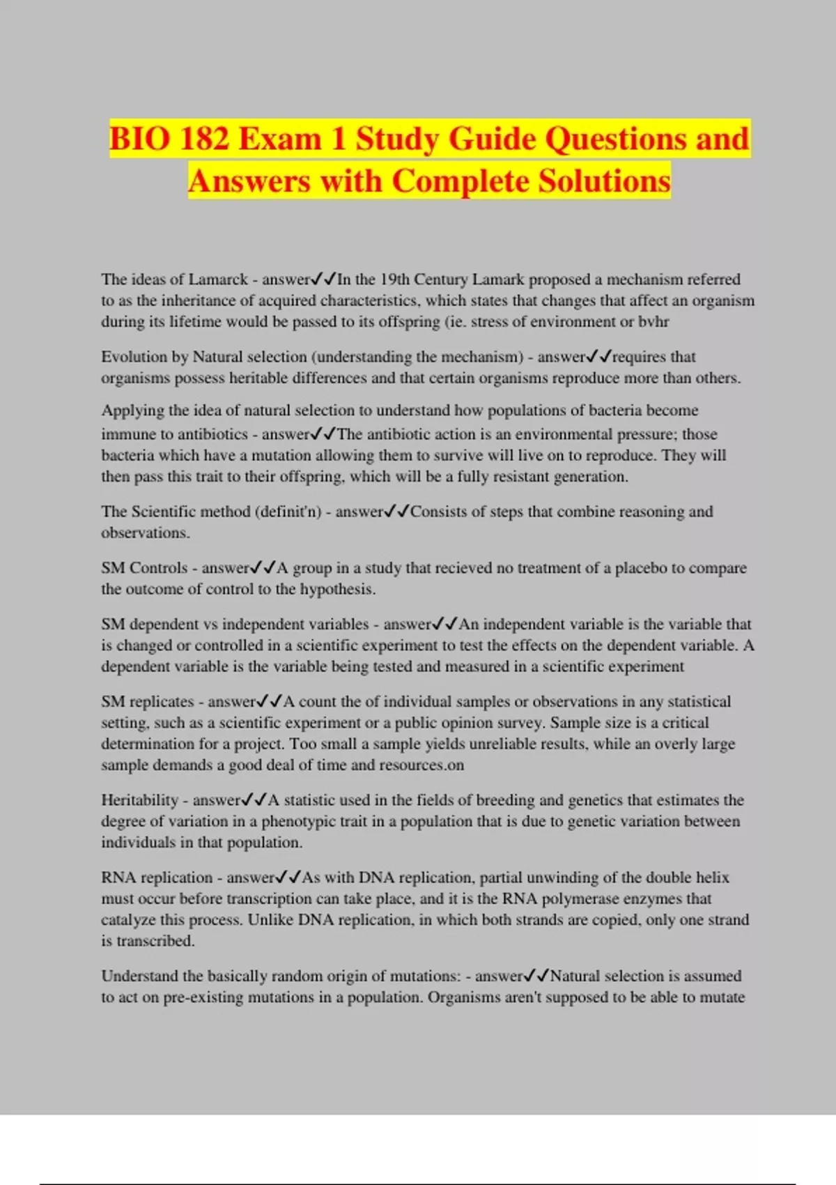 BIO 182 Exam 1 Study Guide Questions and Answers with Complete Solutions The ideas of Lamarck - answerIn the 19th Century Lamark proposed a mechanism referred to as the inheritance of acquired characteristics, which states that changes that affect an organism during its lifetime would be passed to its offspring (ie. stress of environment or bvhr Evolution by Natural selection (understanding the mechanism) - answerrequires that organisms possess heritable differences and that certain organisms reproduce more than others. Applying the idea of natural selection to understand how populations of bacteria become immune to antibiotics - answerThe antibiotic action is an environmental pressure; those bacteria which have a mutation allowing them to survive will live on to reproduce. They will then pass this trait to their offspring, which will be a fully resistant generation. The Scientific method (definit'n) - answerConsists of steps that combine reasoning and observations. SM Controls - answerA group in a study that recieved no treatment of a placebo to compare the outcome of control to the hypothesis. SM dependent vs independent variables - answerAn independent variable is the variable that is changed or controlled in a scientific experiment to test the effects on the dependent variable. A dependent variable is the variable being tested and measured in a scientific experiment SM replicates - answerA count the of individual samples or observations in any statistical setting, such as a scientific experiment or a public opinion survey. Sample size is a critical determination for a project. Too small a sample yields unreliable results, while an overly large sample demands a good deal of time and resour