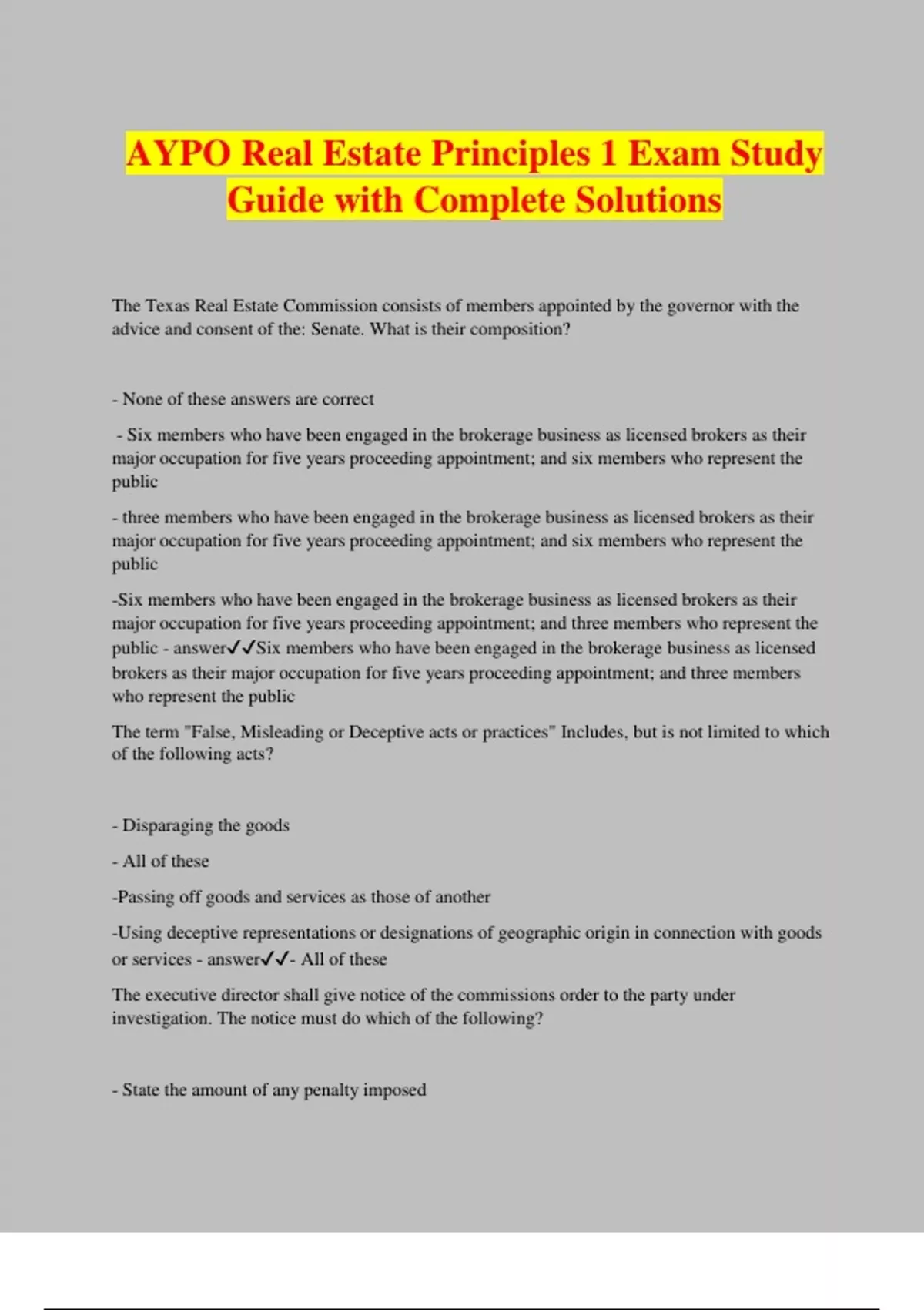 AYPO Real Estate Principles 1 Exam Study Guide with Complete Solutions The Texas Real Estate Commission consists of members appointed by the governor with the advice and consent of the: Senate. What is their composition? - None of these answers are correct - Six members who have been engaged in the brokerage business as licensed brokers as their major occupation for five years proceeding appointment; and six members who represent the public - three members who have been engaged in the brokerage business as licensed brokers as their major occupation for five years proceeding appointment; and six members who represent the public -Six members who have been engaged in the brokerage business as licensed brokers as their major occupation for five years proceeding appointment; and three members who represent the public - answerSix members who have been engaged in the brokerage business as licensed brokers as their major occupation for five years proceeding appointment; and three members who represent the public The term "False, Misleading or Deceptive acts or practices" Includes, but is not limited to which of the following acts? - Disparaging the goods - All of these -Passing off goods and services as those of another -Using deceptive representations or designations of geographic origin in connection with goods or services - answer- All of these The executive director shall give notice of the commissions order to the party under investigation. The notice must do which of the following? - State the amount of any penalty impose
