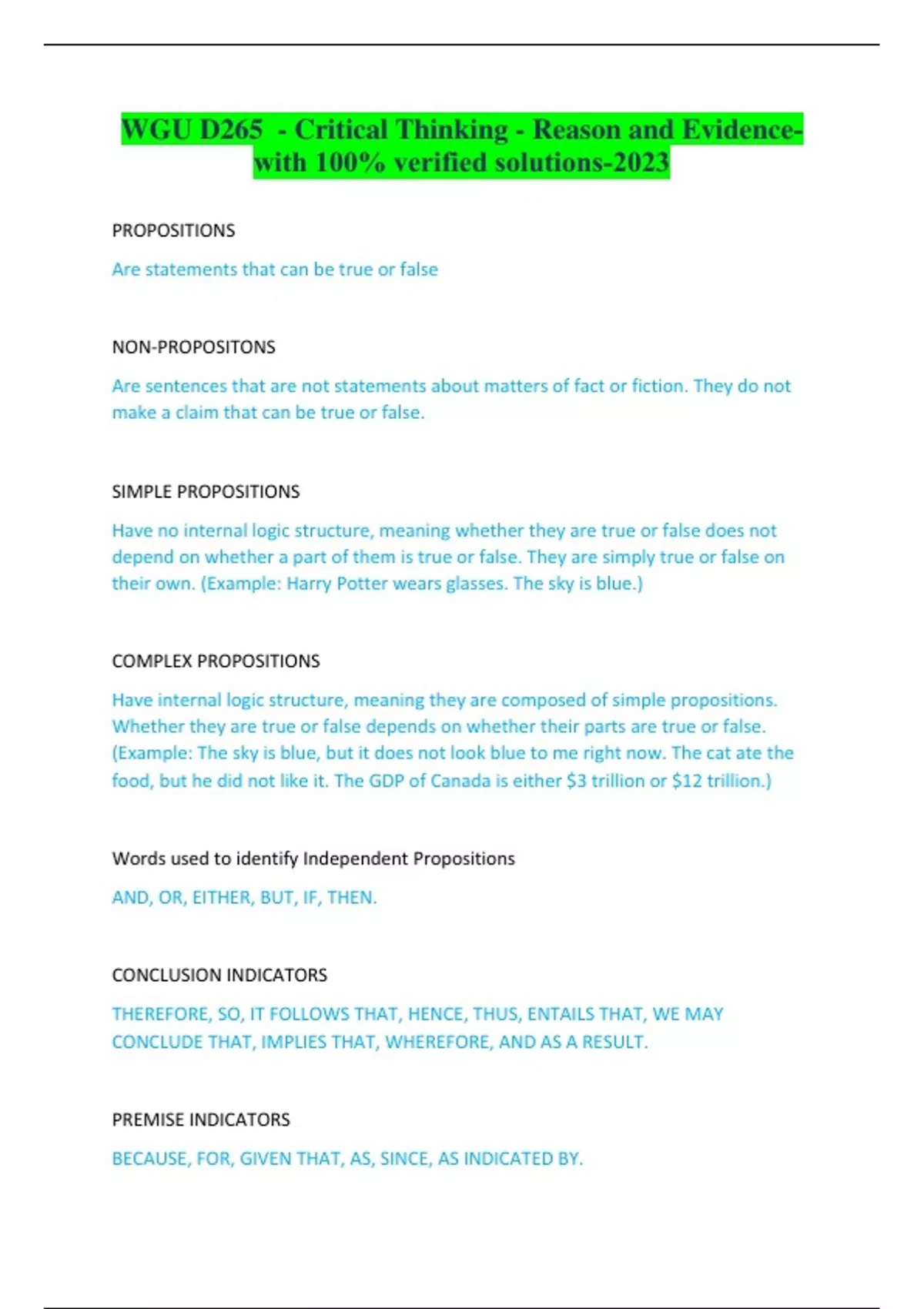 WGU D265 - Critical Thinking - Reason and Evidence-with 100% verified solutions-2023