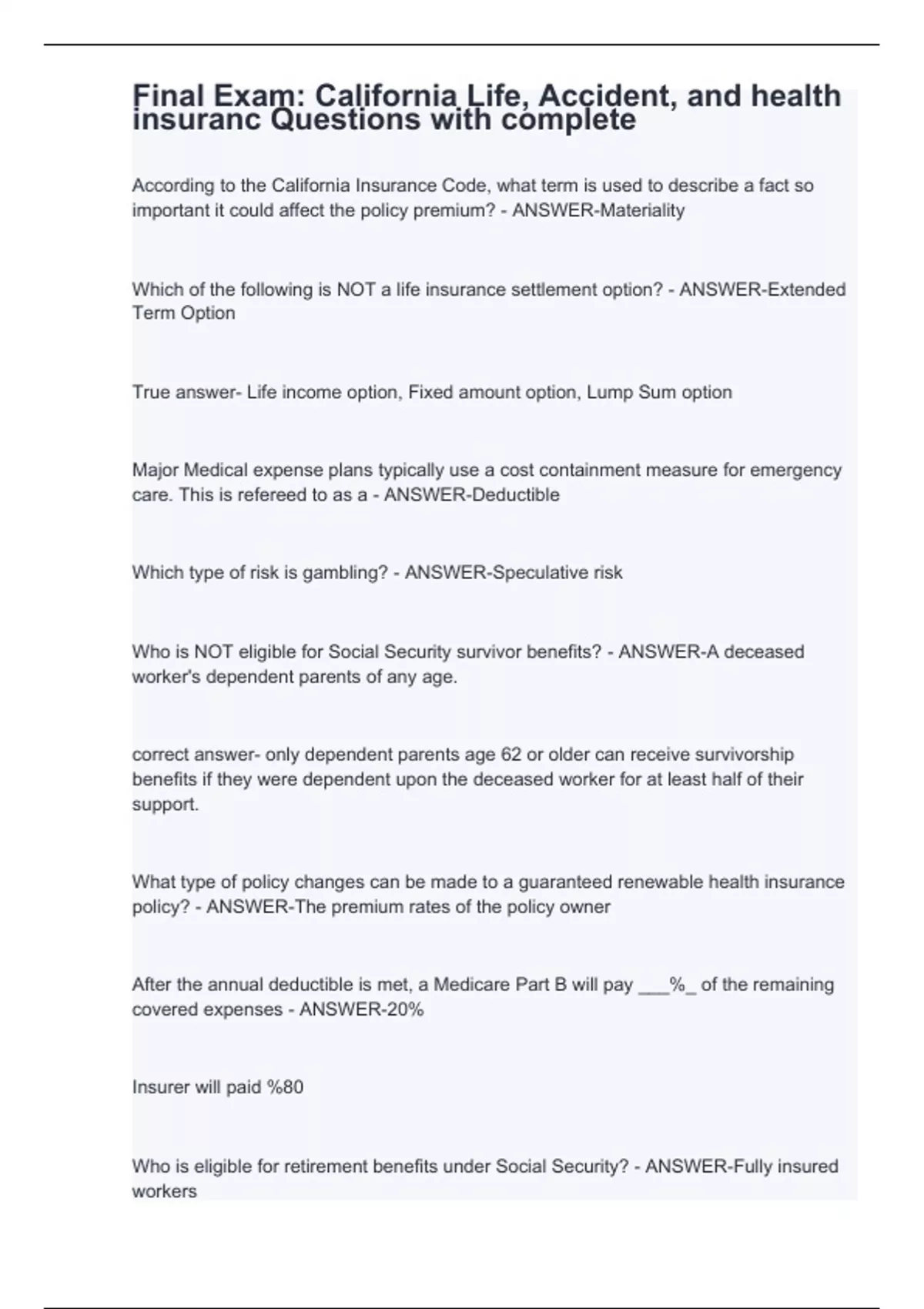 According to the California Insurance Code, what term is used to describe a fact so important it could affect the policy premium? - ANSWER-Materiality Which of the following is NOT a life insurance settlement option? - ANSWER-Extended Term Option True answer- Life income option, Fixed amount option, Lump Sum option Major Medical expense plans typically use a cost containment measure for emergency care. This is refereed to as a - ANSWER-Deductible Which type of risk is gambling? - ANSWER-Speculative risk Who is NOT eligible for Social Security survivor benefits? - ANSWER-A deceased worker's dependent parents of any age. correct answer- only dependent parents age 62 or older can receive survivorship benefits if they were dependent upon the deceased worker for at least half of their support. What type of policy changes can be made to a guaranteed renewable health insurance policy? - ANSWER-The premium rates of the policy owner After the annual deductible is met, a Medicare Part B will pay ___%_ of the remaining covered expenses - ANSWER-20% Insurer will paid %80