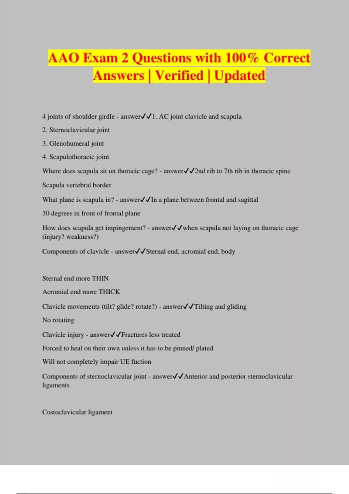 AAO Exam 2 Questions with 100% Correct Answers | Verified | Updated 4 joints of shoulder girdle - answer1. AC joint clavicle and scapula 2. Sternoclavicular joint 3. Glenohumeral joint 4. Scapulothoracic joint Where does scapula sit on thoracic cage? - answer2nd rib to 7th rib in thoracic spine Scapula vertebral border What plane is scapula in? - answerIn a plane between frontal and sagittal 30 degrees in front of frontal plane How does scapula get impingement? - answerwhen scapula not laying on thoracic cage (injury? weakness?) Components of clavicle - answerSternal end, acromial end, body Sternal end more THIN Acromial end more THICK Clavicle movements (tilt? glide? rotate?) - answerTilting and gliding No rotating Clavicle injury - answerFractures less treated Forced to heal on their own unless it has to be pinned/ plated Will not completely impair UE fuction Components of sternoclavicular joint - answerAnterior and posterior sternoclavicular ligaments Costoclavicular ligament Interclavicular ligament Articular disc (gliding/tilt clavicle "anterior and posterior rotations") Components of acromioclavicular joint - answerSuperior and inferior acromioclavicular ligaments (joint capsule is unstable) Coracoclavicular ligaments (medial "conoid" portion and lateral "trapezoid" portion) Coracoacromial ligament (shoulder stability, just attaches 2 points of scapula not actually crossing clavicle) Form a roof over our shoulder The space below that is what causes pain/issues Scapula motions - answerElevation, depression, protraction, retraction Upward rotation: inferior angle rotating up/ away from spine Downward rotation: inferior angle rotating down/ closer to spine Scapular tilt: inferior angle coming up and away from thoracic cage (ex: clasp hands behind back and extend arms fully, does not happen w functional movements) Scapulohumeral rhythm: maintain this, scapula across thoracic cage... humerus in glenoid... full upper limb elevation... tilts glenoid fossa up... 30 deg abduction Shoulder girdle muscles - answerUpper trapezius: scapula elevation and upward rotation at acromion Middle trapezius: scapula retraction Lower trapezius: scapula depression and upward rotation just like upper trap too Levator scapula: scapula elevation and