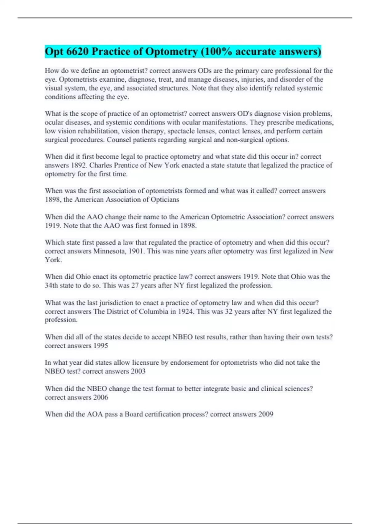 How do we define an optometrist? correct answers ODs are the primary care professional for the eye. Optometrists examine, diagnose, treat, and manage diseases, injuries, and disorder of the visual system, the eye, and associated structures. Note that they also identify related systemic conditions affecting the eye. What is the scope of practice of an optometrist? correct answers OD's diagnose vision problems, ocular diseases, and systemic conditions with ocular manifestations. They prescribe medications, low vision rehabilitation, vision therapy, spectacle lenses, contact lenses, and perform certain surgical procedures. Counsel patients regarding surgical and non-surgical options. When did it first become legal to practice optometry and what state did this occur in? correct answers 1892. Charles Prentice of New York enacted a state statute that legalized the practice of optometry for the first time. When was the first association of optometrists formed and what was it called? correct answers 1898, the American Association of Opticians When did the AAO change their name to the American Optometric Association? correct answers 1919. Note that the AAO was first formed in 1898. Which state first passed a law that regulated the practice of optometry and when did this occur? correct answers Minnesota, 1901. This was nine years after optometry was first legalized in New York. When did Ohio enact its optometric practice law? correct answers 1919. Note that Ohio was the 34th state to do so. This was 27 years after NY first legalized the profession. What was the last jurisdiction to enact a practice of optometry law and when did this occur? correct answers The District of Columbia in 1924. This was 32 years after NY first legalized the profession. When did all of the states decide to accept NBEO test results, rather than having their own tests? correct answers 1995 In what year did states allow licensure by endorsement for optometrists who did not take the NBEO test? correct answers 2003 When did the NBEO change the test format to better integrate basic and clinical sciences? correct answers 2006 When did the AOA pass a Board certification process? correct answers 2009