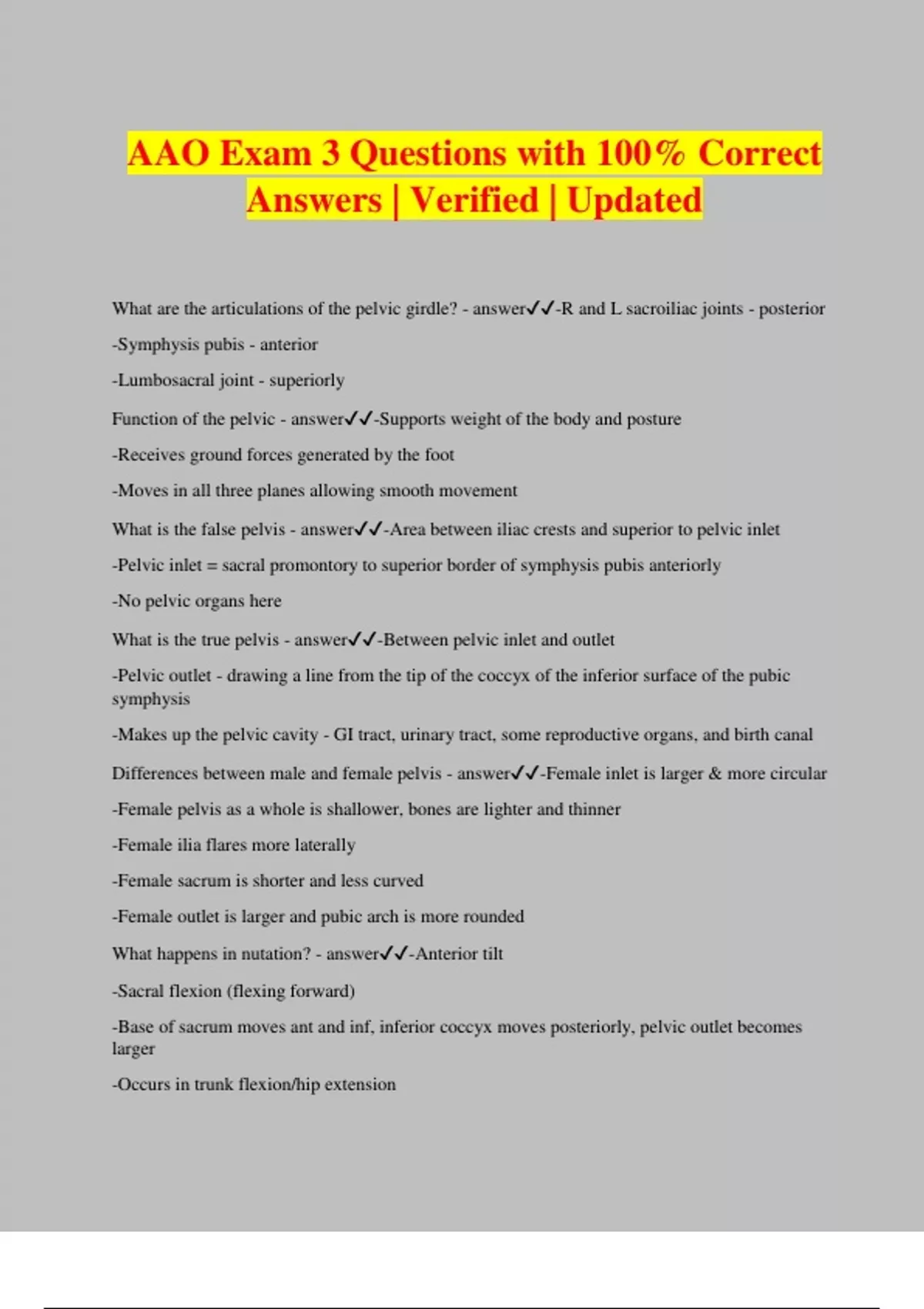AAO Exam 3 Questions with 100% Correct Answers | Verified | Updated What are the articulations of the pelvic girdle? - answer-R and L sacroiliac joints - posterior -Symphysis pubis - anterior -Lumbosacral joint - superiorly Function of the pelvic - answer-Supports weight of the body and posture -Receives ground forces generated by the foot -Moves in all three planes allowing smooth movement What is the false pelvis - answer-Area between iliac crests and superior to pelvic inlet -Pelvic inlet = sacral promontory to superior border of symphysis pubis anteriorly -No pelvic organs here What is the true pelvis - answer-Between pelvic inlet and outlet -Pelvic outlet - drawing a line from the tip of the coccyx of the inferior surface of the pubic symphysis -Makes up the pelvic cavity - GI tract, urinary tract, some reproductive organs, and birth canal Differences between male and female pelvis - answer-Female inlet is larger & more circular -Female pelvis as a whole is shallower, bones are lighter and thinner -Female ilia flares more laterally -Female sacrum is shorter and less curved -Female outlet is larger and pubic arch is more rounded What happens in nutation? - answer-Anterior tilt -Sacral flexion (flexing forward) -Base of sacrum moves ant and inf, inferior coccyx moves posteriorly, pelvic outlet becomes larger -Occurs in trunk flexion/hip extension -Occupation - reaching down to put your pants on What happens in counternutation? - answer-Posterior tilt -Sacral extension (bending backward) -Base of sacrum moves posteriorly and superiorly, coccyx moves anteriorly, pelvic inlet becomes larger -Occurs in trunk extension/hip flexion What are the ligaments of the pelvis - answeranterior sacroiliac - holds anterior portion of the joint interosseous sacroiliac - Connects the tuberosities of the ilium to the sacrum posterior sacroiliac - short and long (prevents downward sacral movement) Accessory ligaments of the pelvis - answersacrotuberous, sacrospinous (sciatic nerve passes through both of these), iliolumbar What is the pubic symphysis? - answer-R and L pubic bones meet here -fibrocartilage disk lies here -Amphiarthrotic - typically little movement, lots of movement during pregnancy Lumbosacral angle - answer-Increases in anterior tilt/increased lordosis -Decreases in posterior tilt/flat back -Shape and fit of inferior articular process of L5 is seated inside and behind the superior articular process of S1 What are the sagittal plane motions of the pelvic girdle? - answer-Anterior tilt - ASIS moves anterior to pubic symph. Lumbar portion of spine goes into hyperext and hips flex -Posterior tilt - ASIS moves posterior to pubic symph. Tight hamstrings - lumbar curve is flat What are the frontal plane motions of the pelvic girdle? - answer-Lateral tilt - iliac crests are not level -Side that is unsupported (non-WB) is point of reference -Pelvis is level with both feet on the ground What are the transverse plane motions of the pelvic girdle? - answer-Pelvic rotation - one side of the pelvis moves forward or backward -Landmarks - left and right ASIS Force coupling of anterior tilt - answer-Lumbar trunk extensors (erector spinae) pull up posteriorly/shorten -Hip flexors pull down anteriorly/shorten Force coupling of posterior tilt - answer-Sway back -Trunk flexors (abs) pull up anteriorly -Hip extensors (glutes and hamstrings) pull down posteriorly What muscle groups on the R and L sides pull the pelvis to stay level? - answer-Left trunk lateral benders (erector spinae and quadratus lumborum) pull up on the left side -Right hip abductors (gluteus medius and minimus) pull down on the right side Habitual anterior tilt - muscle groups involved - answer-Lumbar spine in hyperextension and hips in flexion -Rectus abdominis, gluteus, and hamstrings are stretched, require strengthened -Hip flexors and erector spinae are shortened, will need to be stretched Habitual posterior tilt - muscle groups involved - answer-Lumbar curve is reduct, hips slightly hyperextend -Rectus abdominis, gluteus, and hamstrings are shortened, require stretching -Hip flexors and erector spinae are