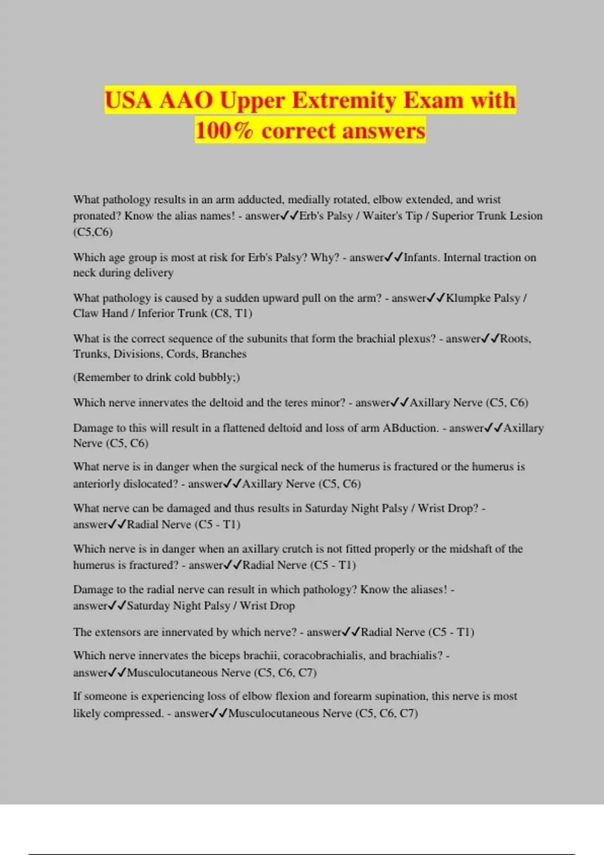 USA AAO Upper Extremity Exam with 100% correct answers What pathology results in an arm adducted, medially rotated, elbow extended, and wrist pronated? Know the alias names! - answerErb's Palsy / Waiter's Tip / Superior Trunk Lesion (C5,C6) Which age group is most at risk for Erb's Palsy? Why? - answerInfants. Internal traction on neck during delivery What pathology is caused by a sudden upward pull on the arm? - answerKlumpke Palsy / Claw Hand / Inferior Trunk (C8, T1) What is the correct sequence of the subunits that form the brachial plexus? - answerRoots, Trunks, Divisions, Cords, Branches (Remember to drink cold bubbly;) Which nerve innervates the deltoid and the teres minor? - answerAxillary Nerve (C5, C6) Damage to this will result in a flattened deltoid and loss of arm ABduction. - answerAxillary Nerve (C5, C6) What nerve is in danger when the surgical neck of the humerus is fractured or the humerus is anteriorly dislocated? - answerAxillary Nerve (C5, C6) What nerve can be damaged and thus results in Saturday Night Palsy / Wrist Drop? - answerRadial Nerve (C5 - T1) Which nerve is in danger when an axillary crutch is not fitted properly or the midshaft of the humerus is fractured? - answerRadial Nerve (C5 - T1) Damage to the radial nerve can result in which pathology? Know the aliases! - answerSaturday Night Palsy / Wrist Drop The extensors are innervated by which nerve? - answerRadial Nerve (C5 - T1) Which nerve innervates the biceps brachii, coracobrachialis, and brachialis? - answerMusculocutaneous Nerve (C5, C6, C7) If someone is experiencing loss of elbow flexion and forearm supination, this nerve is most likely compressed. - answerMusculocutaneous Nerve (C5, C6, C7) A stab wound or surgery to this nerve would result in a winged scapula. Which nerve is it? - answerLong Thoracic Nerve (C5, C6, C7) Someone with a winged scapula will have difficulty with this movement. What is it? - answerCannot ABduct arm above horizontal position This nerve innervates the serratus anterior. What is it? - answerLong Thoracic Nerve (C5, C6, C7) A proximal lesion to the median nerve or supra condylar fracture of the humerus results in this pathology. What is it? - answerPope's Bless