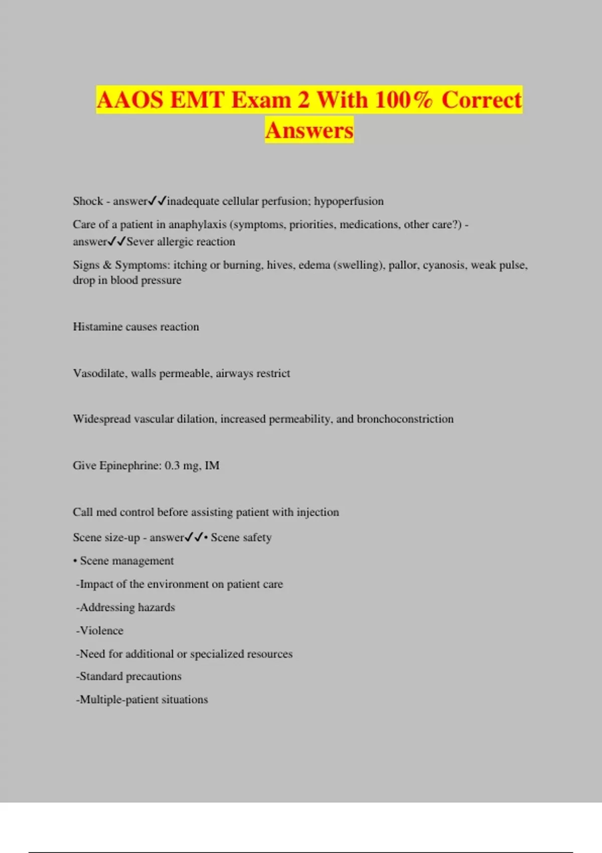 AAOS EMT Exam 2 With 100% Correct Answers Shock - answerinadequate cellular perfusion; hypoperfusion Care of a patient in anaphylaxis (symptoms, priorities, medications, other care?) - answerSever allergic reaction Signs & Symptoms: itching or burning, hives, edema (swelling), pallor, cyanosis, weak pulse, drop in blood pressure Histamine causes reaction Vasodilate, walls permeable, airways restrict Widespread vascular dilation, increased permeability, and bronchoconstriction Give Epinephrine: 0.3 mg, IM Call med control before assisting patient with injection Scene size-up - answer• Scene safety • Scene management -Impact of the environment on patient care -Addressing hazards -Violence -Need for additional or specialized resources -Standard precautions -Multiple-patient situations Primary Assessment - answerPrimary assessment for all patient situations -Level of Consciousness (LOC) -ABCs (Airway, Breathing, Circulation) -Identifying life threats -Assessment of vital functions -Initial general impression -Begin interventions needed to preserve life -Integration of treatment/procedures needed to preserve life Primary Assessment - answerDeter