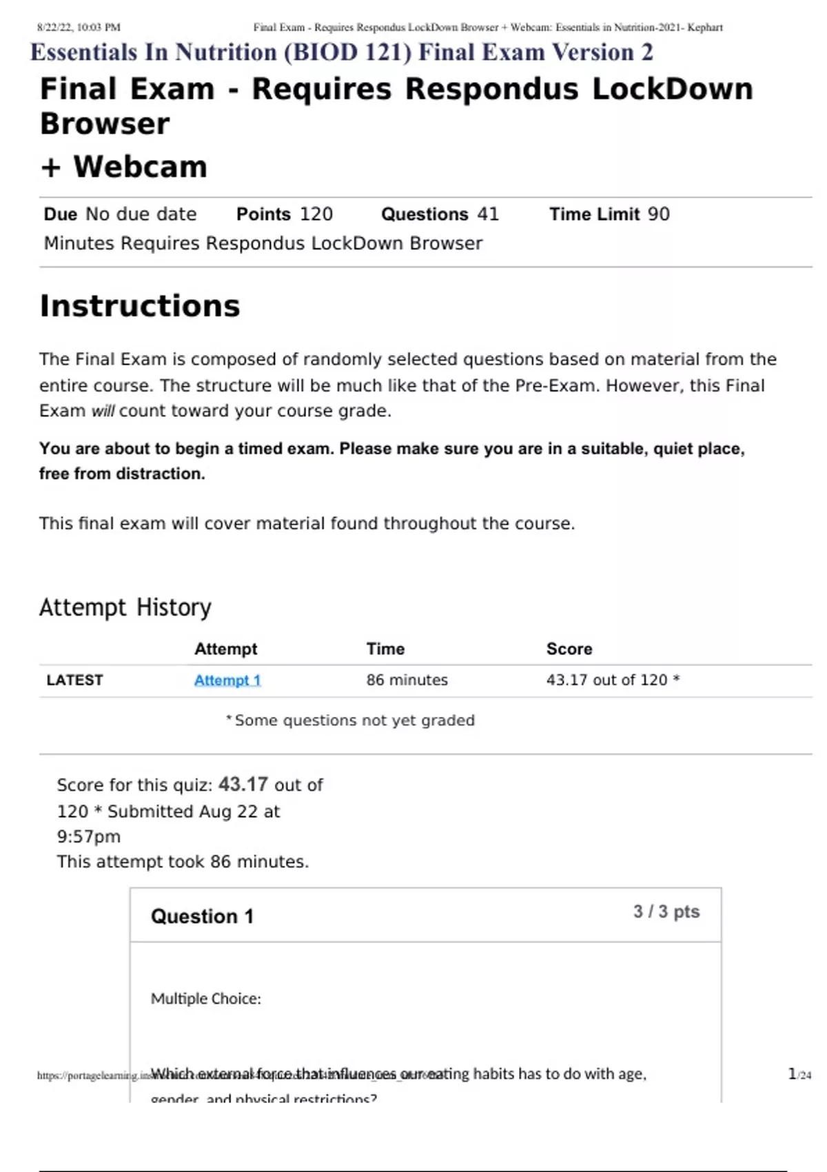 Essentials In Nutrition (BIOD 121) Final Exam Version 2 Final Exam - Requires Respondus LockDown Browser + Webcam Due No due date Points 120 Questions 41 Time Limit 90 Minutes Requires Respondus LockDown Browser Instructions The Final Exam is composed of randomly selected questions based on material from the entire course. The structure will be much like that of the Pre-Exam. However, this Final Exam will count toward your course grade. You are about to begin a timed exam. Please make sure you are in a suitable, quiet place, free from distraction. This final exam will cover material found throughout the course. Attempt History Attempt Time Score LATEST Attempt 1 86 minutes 43.17 out of 120 * * Some questions not yet graded Score for this quiz: 43.17 out of 120 * Submitted Aug 22 at 9:57pm This attempt took 86 minutes.