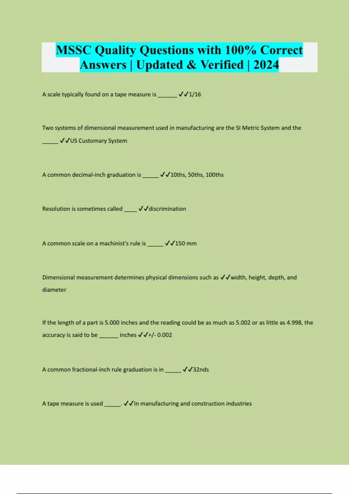 MSSC Quality Questions with 100% Correct Answers | Updated & Verified | 2024