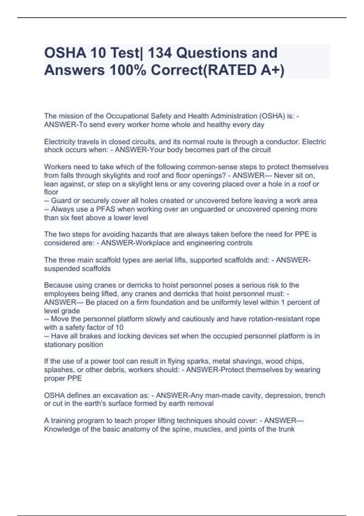 OSHA 10 Test| 134 Questions and Answers 100% Correct(RATED A+)