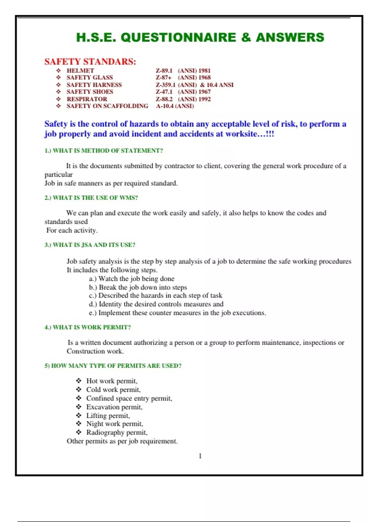 H.S.E. QUESTIONNAIRE QUESTIONS & ANSWERS 2024 UPDATE H.S.E. QUESTIONNAIRE & ANSWERS SAFETY STANDARS: HELMET Z-89.1 (ANSI) 1981 SAFETY GLASS Z-87+ (ANSI) 1968 SAFETY HARNESS Z-359.1 (ANSI) & 10.4 ANSI SAFETY SHOES Z-47.1 (ANSI) 1967 RESPIRATOR Z-88.2 (ANSI) 1992 SAFETY ON SCAFFOLDING A-10.4 (ANSI) Safety is the control of hazards to obtain any acceptable level of risk, to perform a job properly and avoid incident and accidents at worksite…!!! 1.) WHAT IS METHOD OF STATEMENT? It is the documents submitted by contractor to client, covering the general work procedure of a particular Job in safe manners as per required standard. 2.) WHAT IS THE USE OF WMS? We can plan and execute the work easily and safely, it also helps to know the codes and standards used For each activity. 3.) WHAT IS JSA AND ITS USE? Job safety analysis is the step by step analysis of a job to determine the safe working procedures It includes the following steps. a.) Watch the job being done b.) Break the job down into steps c.) Described the hazards in each step of task d.) Identity the desired controls measures and e.) Implement these counter measures in the job executions. 4.) WHAT IS WORK PERMIT? Is a written document authorizing a person or a group to perform maintenance, inspections or Construction work. 5) HOW MANY TYPE OF PERMITS ARE USED? Hot work permit, Cold work permit, Confined space entry permit, Excavation permit, Lifting permit, Night work permit, Radiography permit, Other permits as per job requirement. 2 6). What is Safety? Safety is a state where the Risk has been Eliminated or Reduced to an Acceptable Level. Control of Accidental Loss of Resources Human and Material 7). What is near-miss? An undesirable event which has the potential to cause loss 8). WHAT IS CONFINED SPACE? Any space having a limited means of access and egress, when subject to the hazards like deficiency of Oxygen, toxic or flammable gases or substances, dust etc. 9). WHAT IS THE OXYGEN LEVEL IN A CONFINED SPACE? The Oxygen level in Confined space is 19.5% to 23.5%. 10). IN WHAT CIRCUMTANCES A CONFINED SPACE WORK PERMIT CAN BE ISSUED? If properly ventilated, gas test reading are satisfactory, properly barricaded and warning signs are Posted, trained stand by man is present with log sheet, sufficient lightening and low voltage Electricity (24V-110V), proper means of communication, locked and tagged out if necessary, lifeline man retrieval System if necessary etc. 11). WHO IS CONFINED SPACE ATTENNDANT? He is one who is aware of the confined space hazards and knows how to react if any thing goes wrong, able to maintain confined space entry log sheet etc. 12). WHAT ARE THE HAZARDS IN A CONFINED SPACE? Oxygen Deficiency or Enrichment, presence of toxic or flammable gases, chemical hazards fire hazards Fall of materials fall hazards electrocution dust sounds heat or cold caught in between moving Equipments engulfment etc. 13). WHAT ARE THE DUTIES OF A CONFINED SPACE ATTENDANT? He is responsible for the safety of entrants, should be present whenever people are working in confined space, maintain update entry log sheet, maintain continuous communication with entrants and monitor conditions in the confined space to ensure a safe working atmosphere, prevent unauthorized personnel, initiate alarm for help if in need evacuate the entrants if conditions are not satisfying or in case of any general evacuation initiated contact rescue personnel if necessary etc. 3 14). GIVE SOME EXAMPLE OF A CONFINED SPACE? Pipes, Vessels, Tanks, boilers, and Tube areas Silos Trenches and excavation deeper then 4feet sludge Pits Duct works etc. 15). NAME ONE HAZARDOUS JOB IN A CONFINED SPACE? Welding Grinding Chemical Use of gas cutting sets erection of materials 16). WHO IS COMPETENT PERSONS? Is one who is properly trained and authorized to perform a specific work in a safe manner competent person one who is capable of identifying existing predictable hazards and who has authority to make prompt corrective actions. 17). WHAT IS ACCIDENT? Accident is uncontrolled events that results in undesirable consequences to personnel injury, illness of the assets damage or loss or to the environment. An Undesirable event which causes harm to personal Damage to property. 18). WHAT IS A NEARMISS? A Potential hazards, which has not yet caused an accident or an occurrence that did not results in but have the potentials to results in undesirable consequences to personnel illness injury and or to the assets damage loss or to the neighboring community and environment. An Undesirable event which has the potential to cause loss. 19). WHO MAKES AN ACCIDENT REPORT? Concerned area supervisor or site safety representatives. 20). WHO MAKES AN ACCIDENT INVESTIGATION REPORT? A team of frontline supervisor, HSE manager sub contractor representatives if subcontractor personnel Are injured high officials depending upon the severity of accident. 21). WHAT IS THE USED OF ACCIDENT REPORT? To find out the root cause of accident makes recommendations to prevent re-occurrence and evaluate the effectiveness of emergency response. 22). WHAT IS WASTE MANAGEMENT? Waste management means safely disposing the by-product of a process or a work to the environment after the proper treatment if necessary so that no threat for living properties and environment exists. 23). WHAT IS MSDS? Materials safety data sheets is the documents prepared by the manufacturer giving product name producer address emergency contact phone number information of ingredients possible hazards 4 first aid measures precaution to be taken for storage and ha