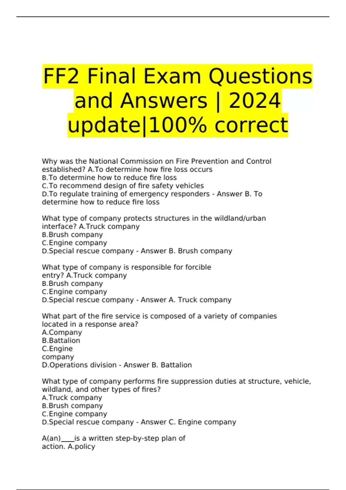Fire Fighter (FF2) Final Exam Questions and Answers 2024 update|100% FF2 Final Exam Questions and Answers | 2024 update|100% correct Why was the National Commission on Fire Prevention and Control established? A.To determine how fire loss occurs B. To determine how to reduce fire loss C. To recommend design of fire safety vehicles D. To regulate training of emergency responders - Answer B. To determine how to reduce fire loss What type of company protects structures in the wildland/urban interface? A.Truck company B. Brush company C. Engine company D. Special rescue company - Answer B. Brush company What type of company is responsible for forcible entry? A.Truck company B. Brush company C. Engine company D. Special rescue company - Answer A. Truck company What part of the fire service is composed of a variety of companies located in a response area? A.Company B.Battalion C.Engine company D.Operations division - Answer B. Battalion What type of company performs fire suppression duties at structure, vehicle, wildland, and other types of fires? A. Truck company B. Brush company C. Engine company D. Special rescue company - Answer C. Engine company A(an) is a written step-by-step plan of action. A.policy B.standard C.procedure D.ordinance - Answer C. Procedure A(an) is a set of principles or procedures developed by consensus. A.policy B.standard C.procedure D.ordinance - Answer B. Standard A(an) is a collection of rules enacted by law in a particular jurisdiction. A.code B.policy C.standard D.procedure - Answer A. Code Which of the following is one way firefighters can reduce exposure to carcinogens present in fires? A. Clean helmet liners B. Follow good nutritional guidelines C. Maintain positive mental attitudes D. Maintain high levels of physical fitness - Answer A.Clean helmet liners Which of the following NFPA¨ standards establishes the design criteria for protective clothing and equipment? A.1403 B.1582 C.1851 D.1977 - Answer D. 1977 Which NFPA¨ standard specifies the minimum requirements for department safety and health programs? A.1407 B.1500 C.1851 D.1977 - Answer B. 1500 Which of the following is a minimum requirement for protective clothing and equipment as established by NFPA¨ 1500? A. New recruits may not need to train with PPE. B. Most personnel should be fully equipped with PPE. C. Protective equipment must meet current NFPA¨ design standard. D. Protective equipment must meet one of the two most current NFPA¨ design standards. - Answer C. Protective equipment must meet current NFPA design standard According to NFPA¨ 1500 emergency operations are limited to: A.those that are required to save the most lives. B. those that can be safely conducted by personnel on scene. correct