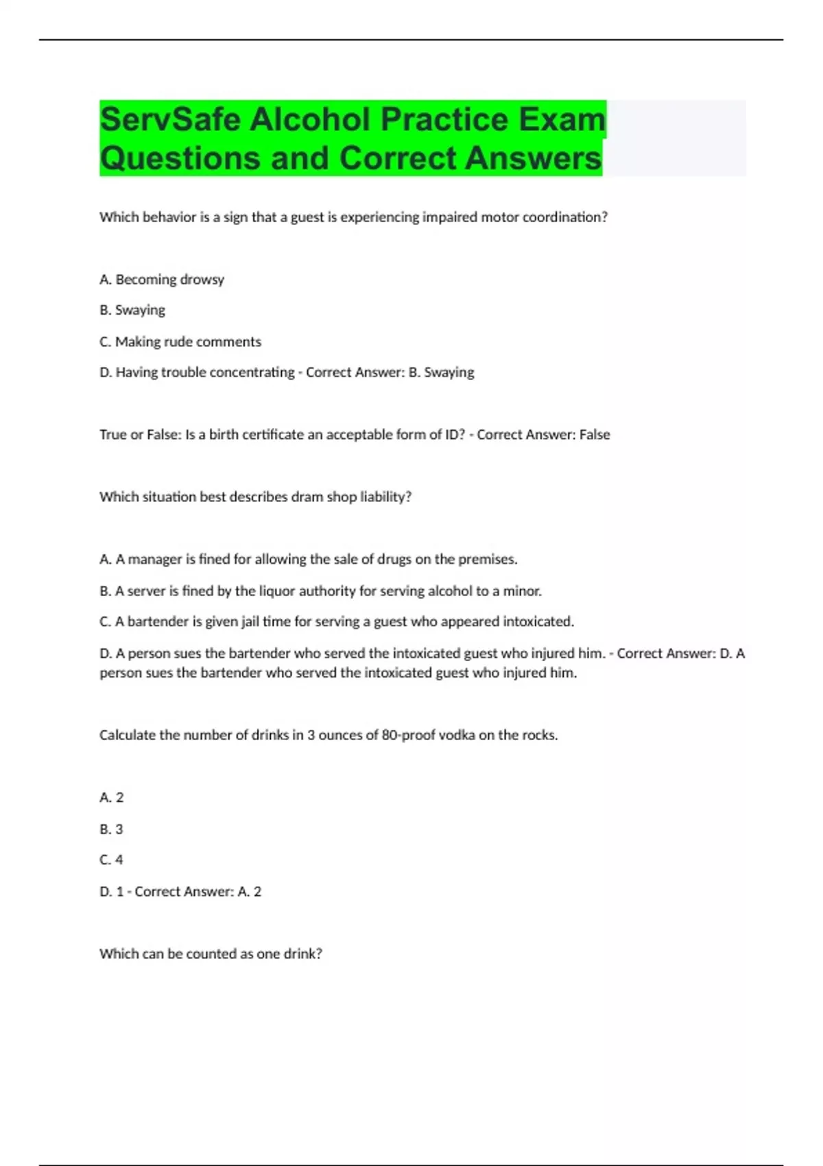 ServSafe Alcohol Practice Exam Questions and Correct Answers