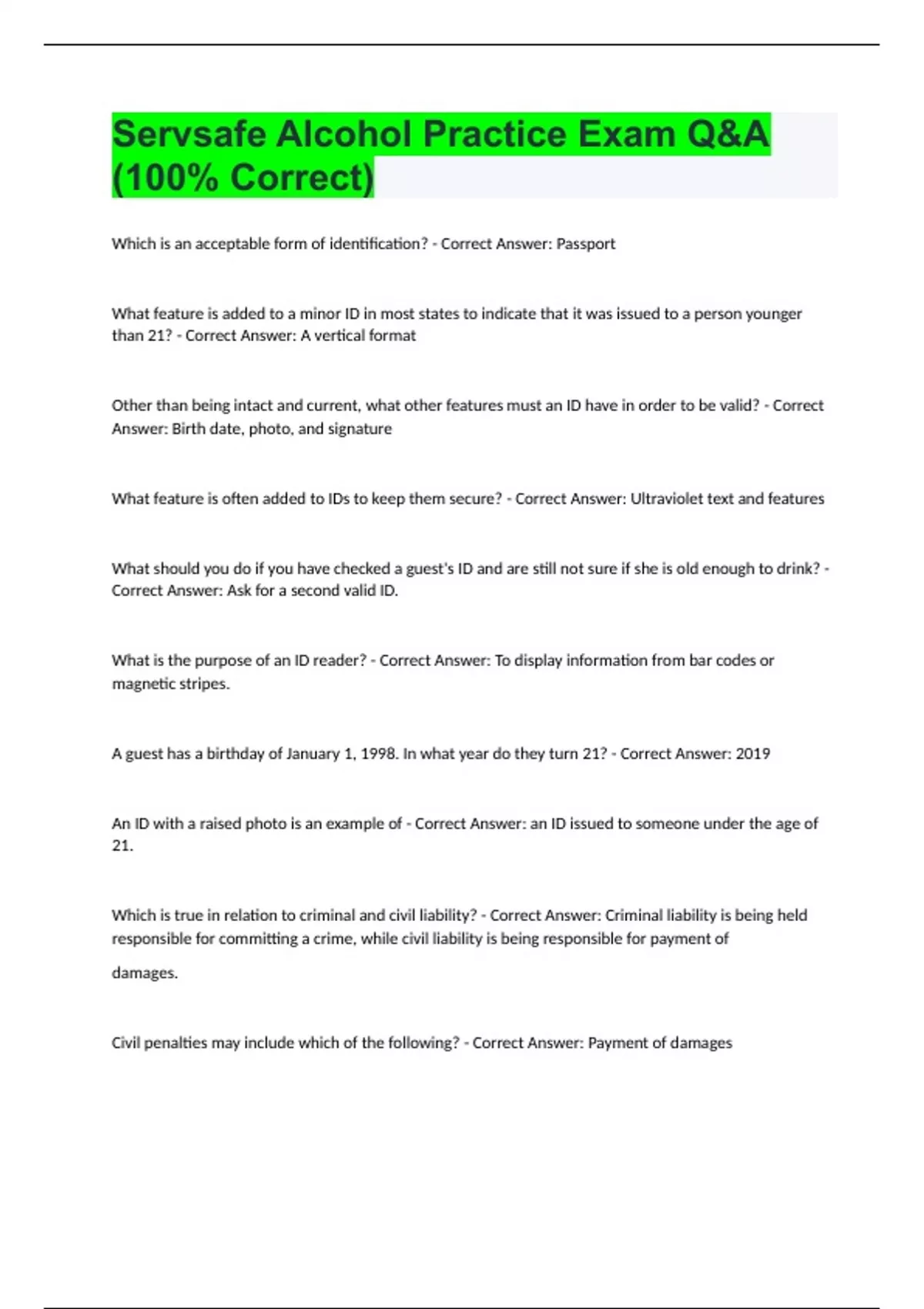 servsafe alcohol practice exam qa 100 correct